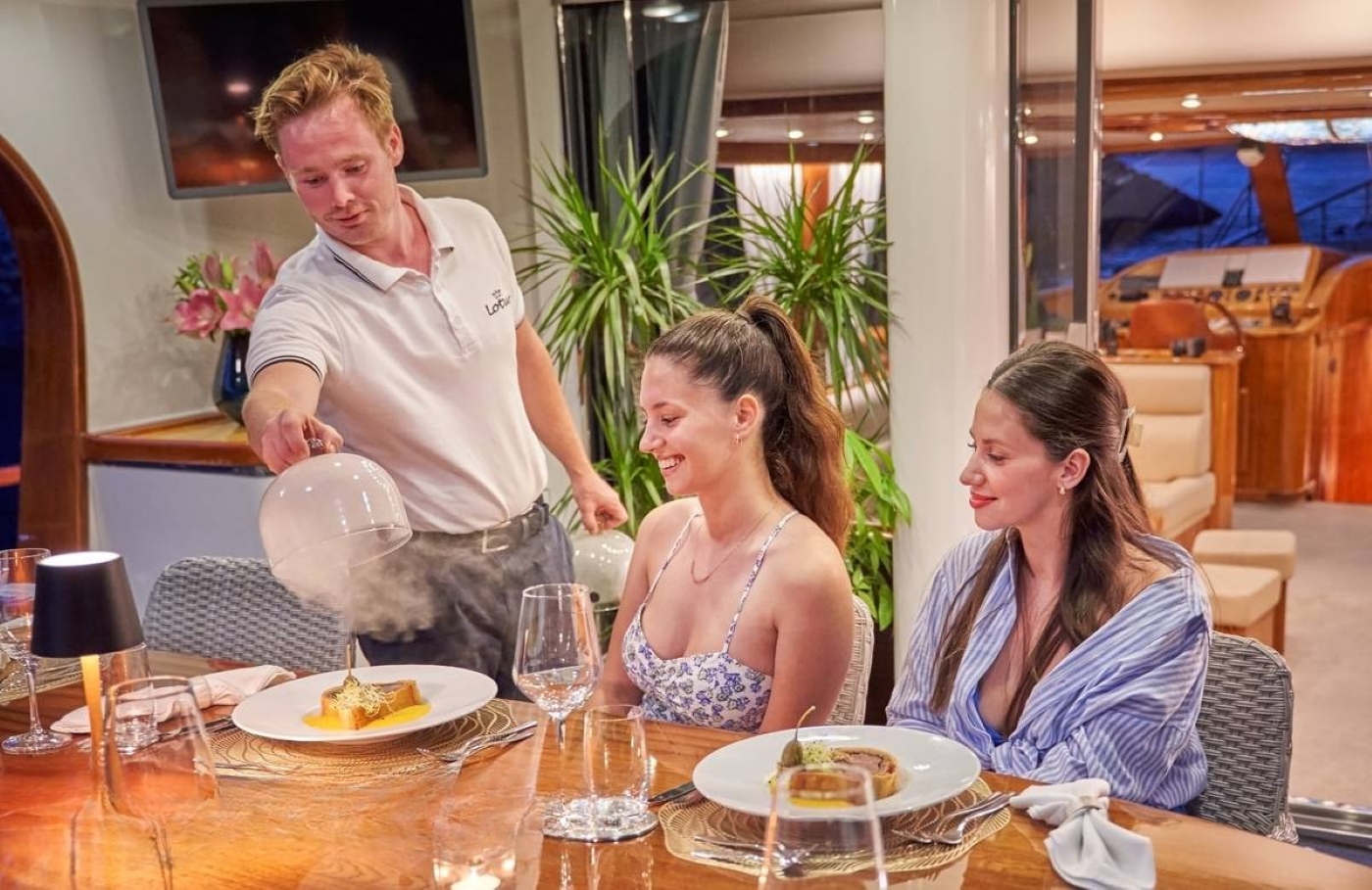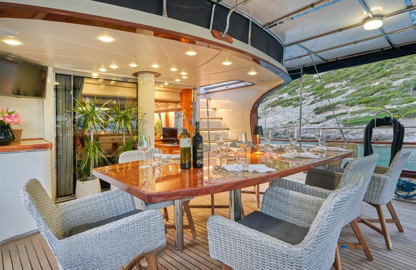 S/Y LOTUS has fabulous outdoor living, which includes a large shaded aft deck offering alfresco dining and a full beam aft sunpad. Forward on the cabin house are numerous sunpads, and a built-in seating area. There is a flybridge deck with an additional cozy dining space, seating and sunning areas.