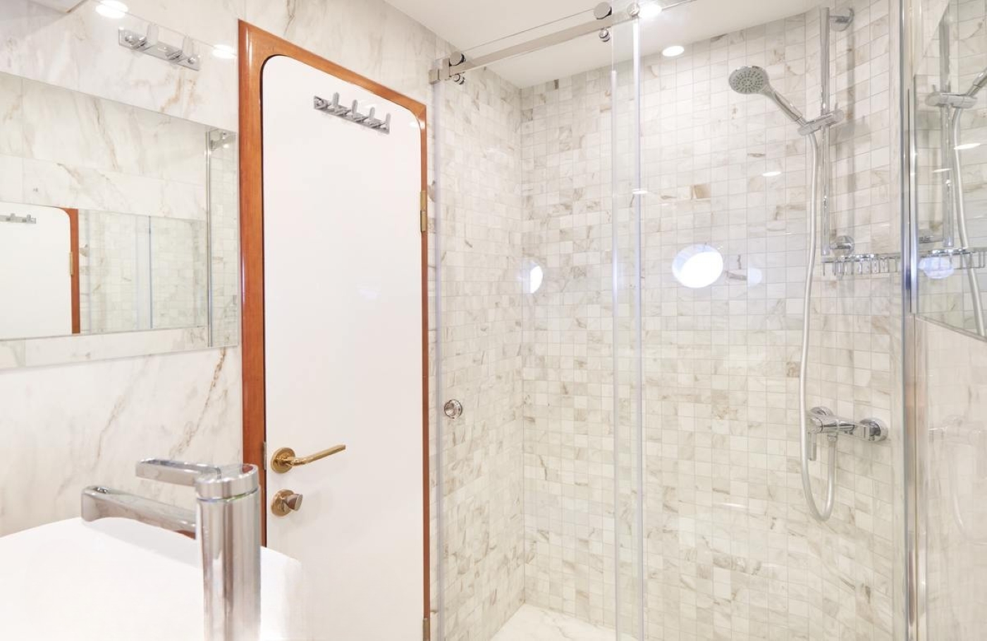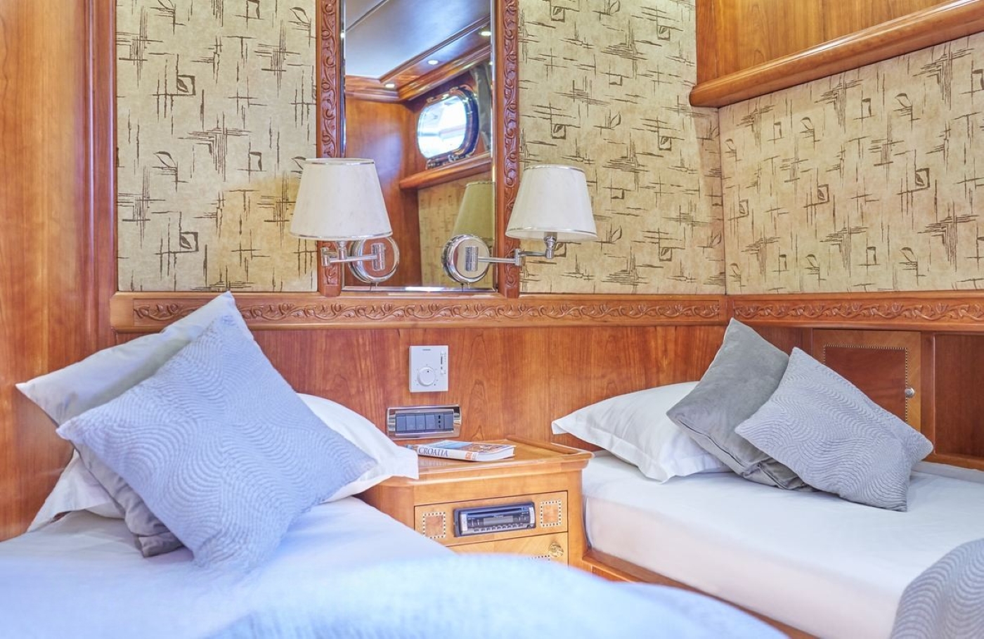 The yachts interior décor is traditional yet timeless with stunning cherry woods and neutral fabrics throughout. In the salon, the lounge is aft with full entertainment systems, while a small dining arrangement is forward.