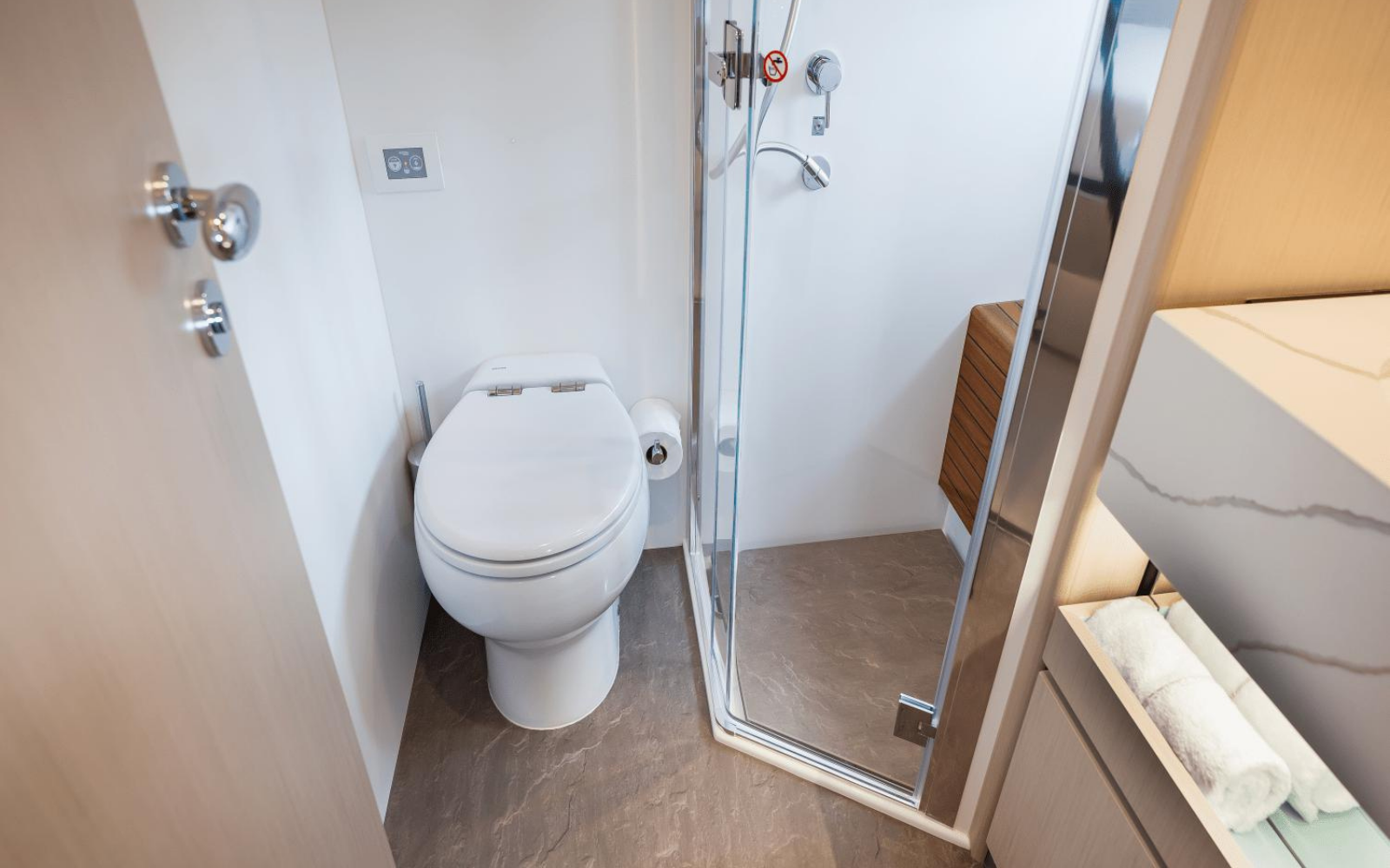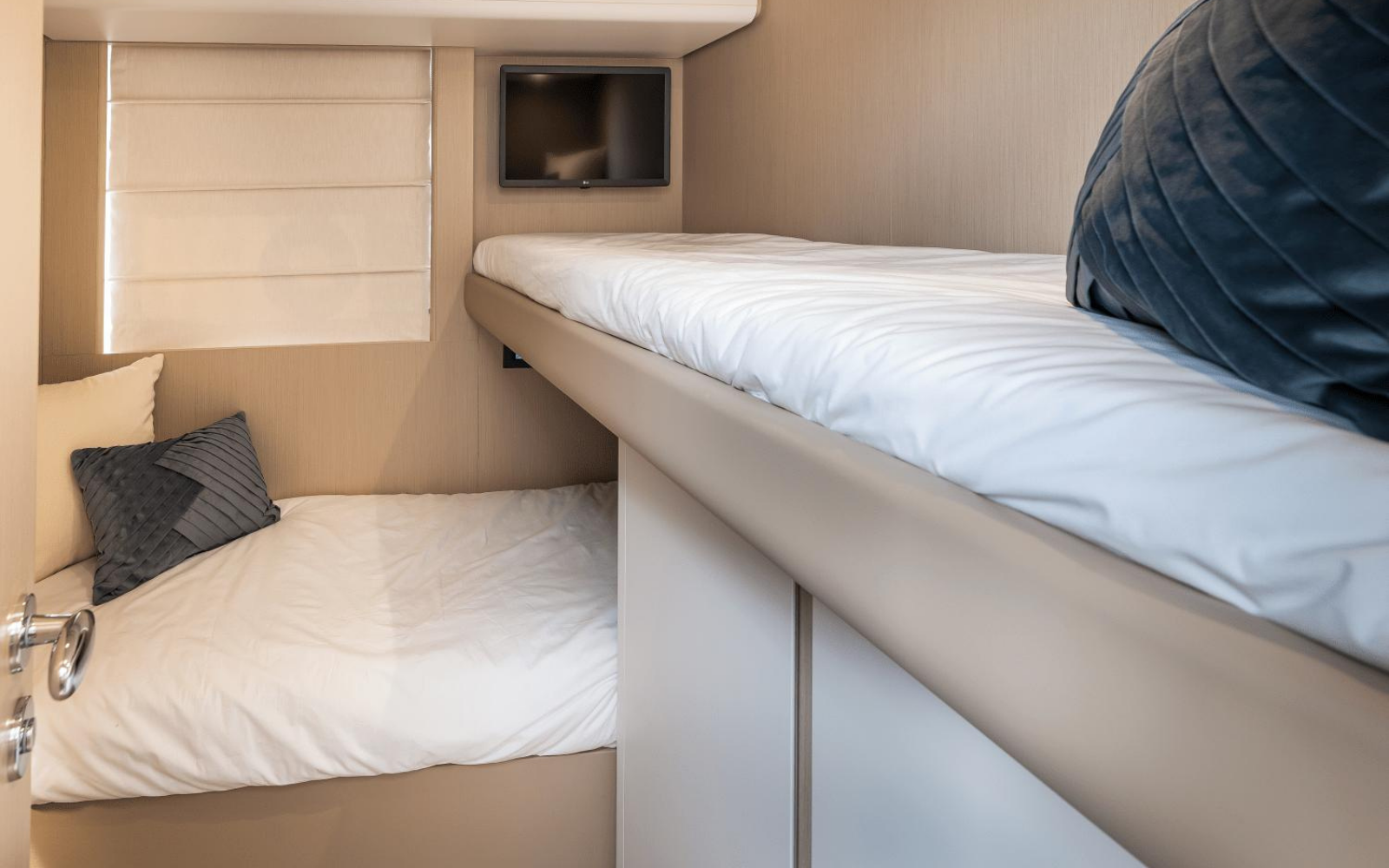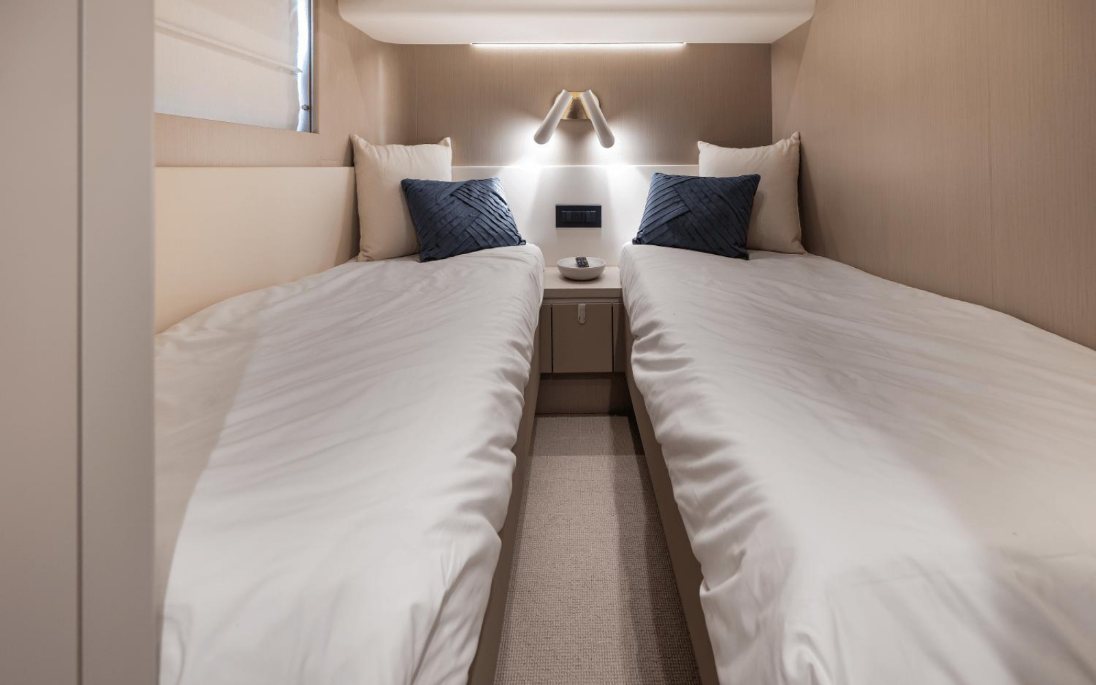 Guest Accommodation: ~She accommodates up to 8 guests, features 4 air-conditioned cabins (Master and VIP with 2 double beds, 2 twins (one of which is with 2 bunk beds). ~Master cabin: 160x200 ~VIP cabin: 160x200 ~Twin cabin (left side) : 70x180 and 75x200 ~Twin cabin (right side): 180x190 (single bed each 70x190)