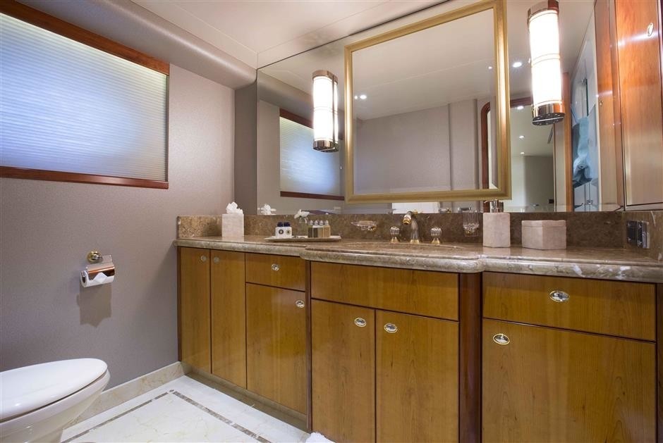 Luxury Motor yacht DESPERADO can accommodate 10 guests in 5 staterooms. The Master cabin is located on the Main deck, forward and spans the full width of the yacht. This superior cabin has huge windows for enjoying in the breathtaking views. The suite boasts a king sized bed, full width His and Hers marble en-suite bathroom with Spa Pool tub and shower, 35" TV/DVD/VCR/DSS/CD Stereo. MX-3000 color touch screen control of all audio/video as well as a Desk with printer and a Wall safe. The remaining 4 staterooms are found below decks. The VIP Stateroom -port has a KING bed, marble ensuite bathroom with shower, 27" TV/DVD/CD Stereo. Pronto touch screen control of all audio/video. Another VIP cabin to the Starboard is identical to the port cabin with King bed, marble ensuite bathroom with shower, 27" TV/DVD/CD Stereo. Pronto touch screen control of all audio/video. The last 2 remaining cabins located to the port and starboard amidships have beds able to convert to either 2 Twin beds or 1 Double bed ensuring all guest have the best bed configuration for their group. This stateroom also has a marble ensuite bathroom with shower, 27" TV/DVD/CD Stereo. Pronto touch screen control of all audio/video.