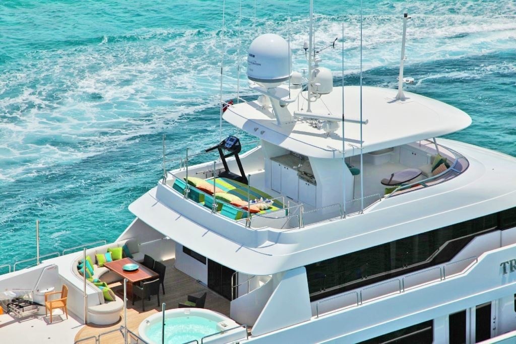 M/Y DESPERADO (ex Trisara, Colors) has an upper deck that features an enclosed sky lounge with a state-of-the-art entertainment center: 32" Flat Tube TV/DVD/CD. MX-3000 color touch screen controls for all audio/video. L-shaped sofa, Game table and full wet bar as well as a powder room forward. The Sky lounge also has access to Boat Deck that has casual dining for 8 to 10 guests an 8-person Spa Pool and stairs leading to the Flybridge and Aft Deck.