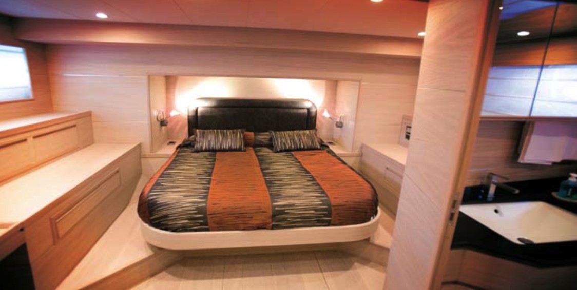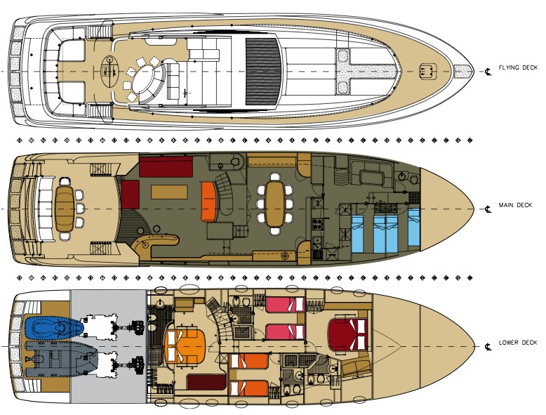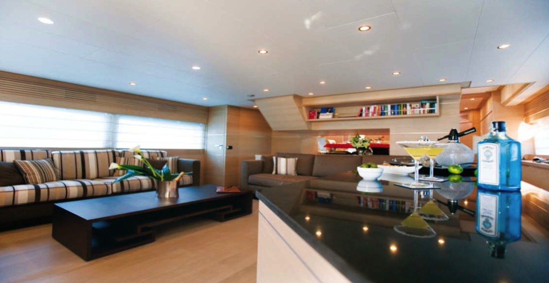 On the yacht’s main deck the efficient use of unusually generous spaces offers a spacious lounge area with a bar. There is also a separate dining area on a higher level, towards the bow. The upper deck houses the fly bridge with two separated areas: one is a beam-wide solarium and one is for dining under the stars. Walking along the sides of the fly, one reaches a lovely area that accommodates the sun mattresses for a separate area of relaxation.