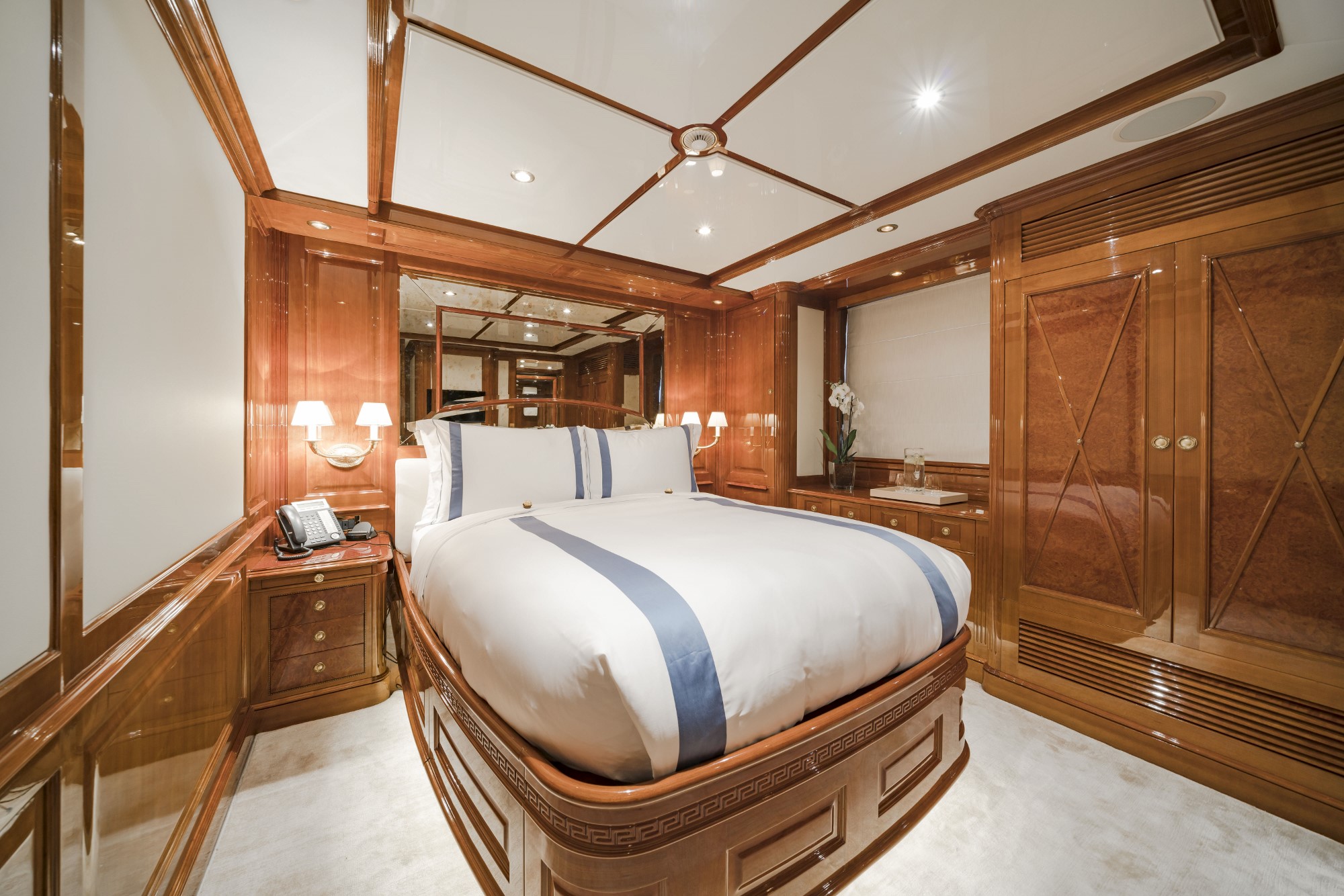 Luxury Mediterranean charter yacht AURA offers luxurious yacht charter accommodation for 10 guests in 5 beautifully appointed en-suite cabins. Master suite on the main deck with en-suite facilities, 2 double VIP & 2 twin cabins below deck with en-suite facilities. Bed sizes: Master Bed: 185 x 210 cm or (6.06’ x 6.89’), 2 VIP Beds: 155 x 200 cm or (5.08’ x 6.56’), 2 Twin Beds: 85 x 195 cm or (2.78’ x 6.4’).