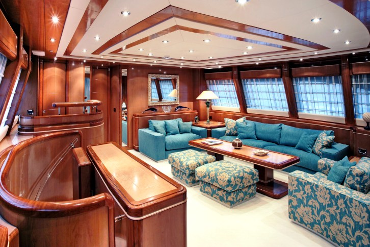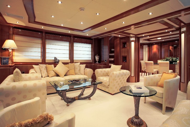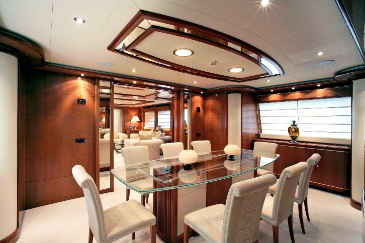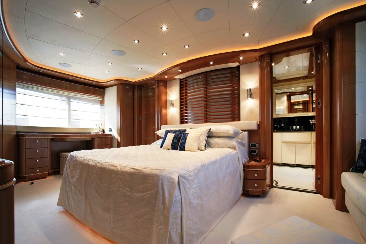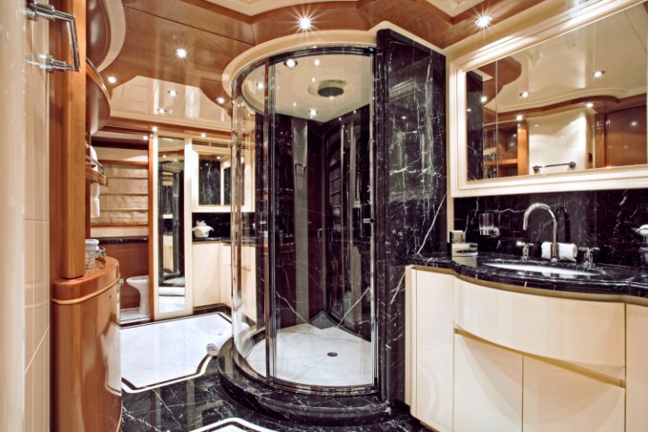 Luxury motor yacht ANNE MARIE offers accommodation for 10/12 guests in 5 generously-sized cabins. Located forward on the main deck, the master stateroom is accessed through a private reception / office area, which can be closed off from the suite if desired. His and hers WCs and bidets sit port and starboard in the bath suite, unified by a large centrally-placed shower unit. Well-appointed guest accommodation is comprised of two twin cabins with oversize single beds and a Pullman each, and two double cabins, with beds sitting at 45 degrees to the beam. The latter two cabins have twin basins and their own full-size tubs, with separate compartments for WCs and bidets. All fabrics and soft furnishings coverings are of the highest quality. elegance silks contemporary italian.