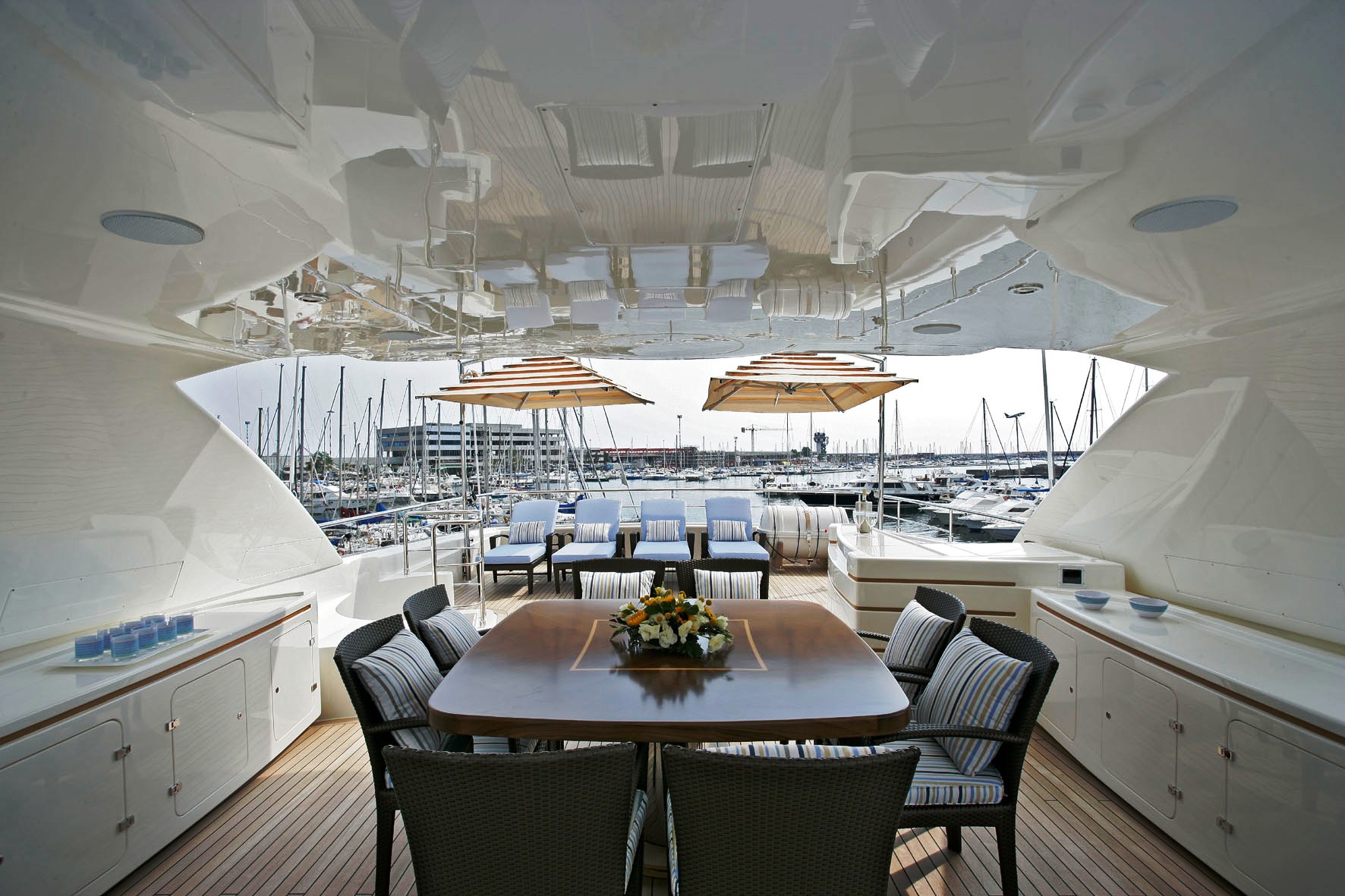 For al fresco dining, the upper deck is the main option with a covered table and seating for 12, while the sundeck also offers a smaller, less formal table arrangement. Teak decking, loungers and umbrellas make the large sundeck a very welcoming and relaxing area, with plenty of space both in the sun and the shade.