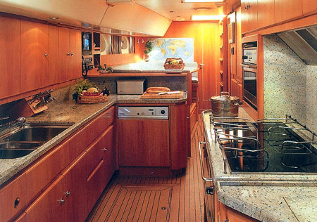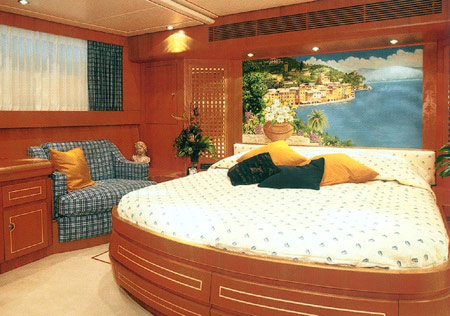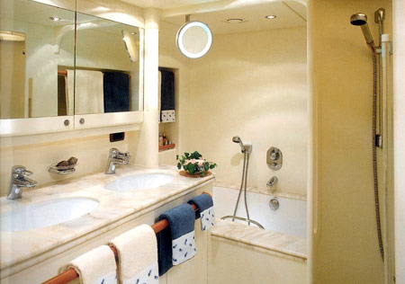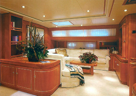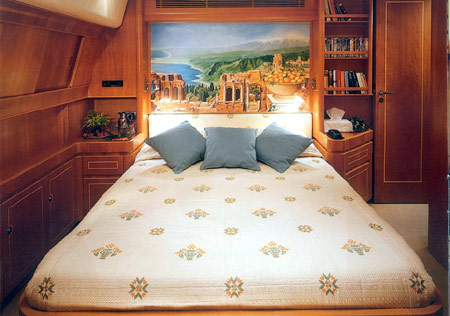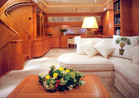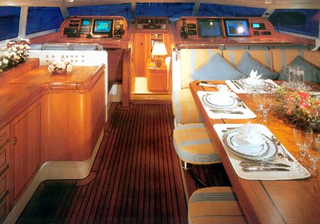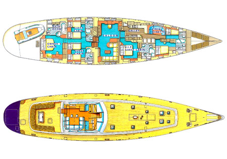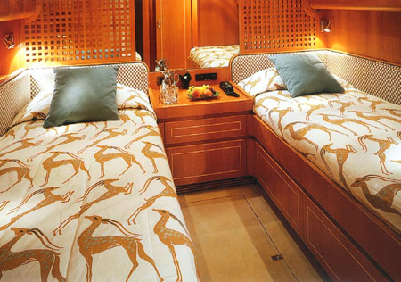 Bagalette's tairs lead down to the quite enchanting saloon, full of light and space. Moving forward there is a VIP guest cabin and a separate crew area. Aft of the saloon and a few steps down are two further guest cabins with twin beds and the owner's suite.