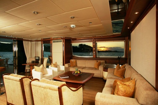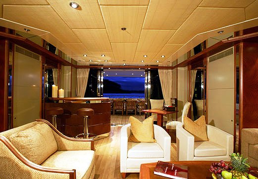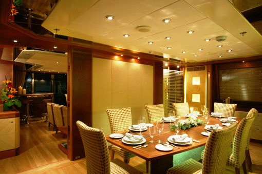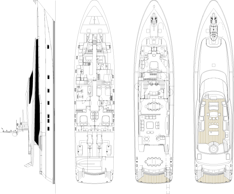 The main deck has an aft cockpit, main saloon with bar and separate dining area for up to 10 guests. Forward off the owner's entrance and study is a master cabin with two ensuites. Forward of the dining area and above the main deck is the bridge. A stairway leads to the flybridge which can also be accessed from the aft cockpit. The flybridge has a bar, spa pool, barbecue and dining for eight. An outside steering station is also located on the flybridge. A three man Seadoo water craft and crew tender are stored on the foredeck.