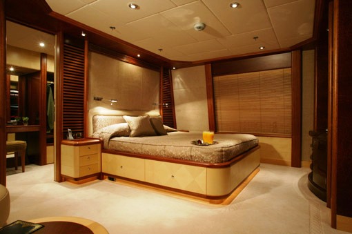 Luxury Motor Yacht SQN of London provides luxury accommodation for 8 charter guests in 4 cabins - as follows: The owner's stateroom is situated on the main deck and comprises a separate study, lounge area, walk-in wardrobe and adjoining 'his & hers' bathrooms. Guests are accommodated on the lower deck in three cabins, all with ensuite facilities and fully independent entertainment systems. Two of the cabins are doubles, while the third has two single beds and a pullman berth. A gym is also located on the lower deck. For family charters the numbers can be made up to 9 using the pullman berth in the twin cabin for children/nanny.