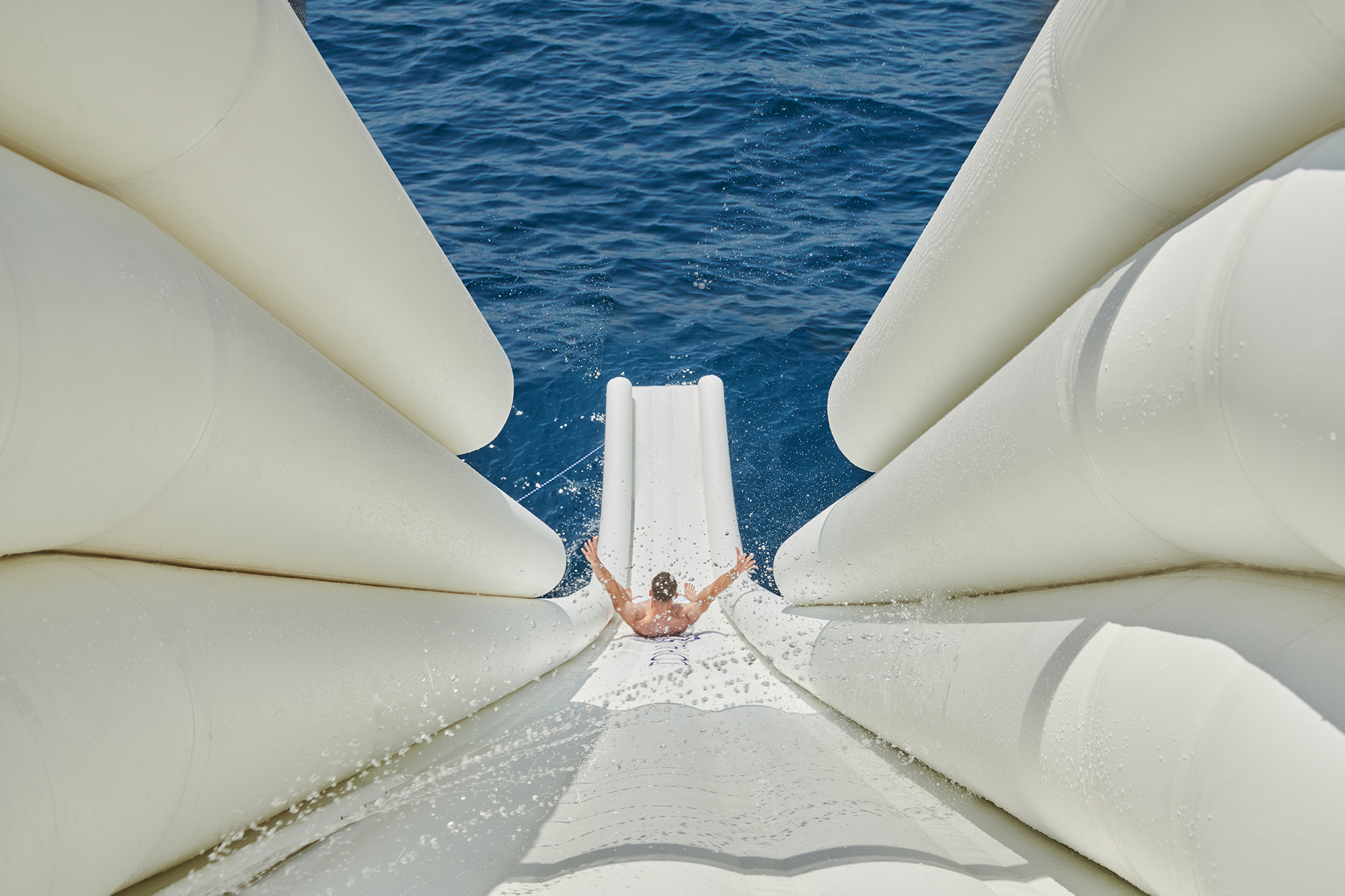 The shaded upper deck can be used for alfresco dining and the table can be placed close to the sky lounge for guests’ convenience. Additional seating is scattered along the sides of the deck for entertaining in the fresh air. The top deck offers an alternative alfresco dining option with a bar-like setup surrounding a barbeque area and guests have views only surpassed by the sundeck, fitted with a forward plunge pool, sun pads and a lounging space in the shade.