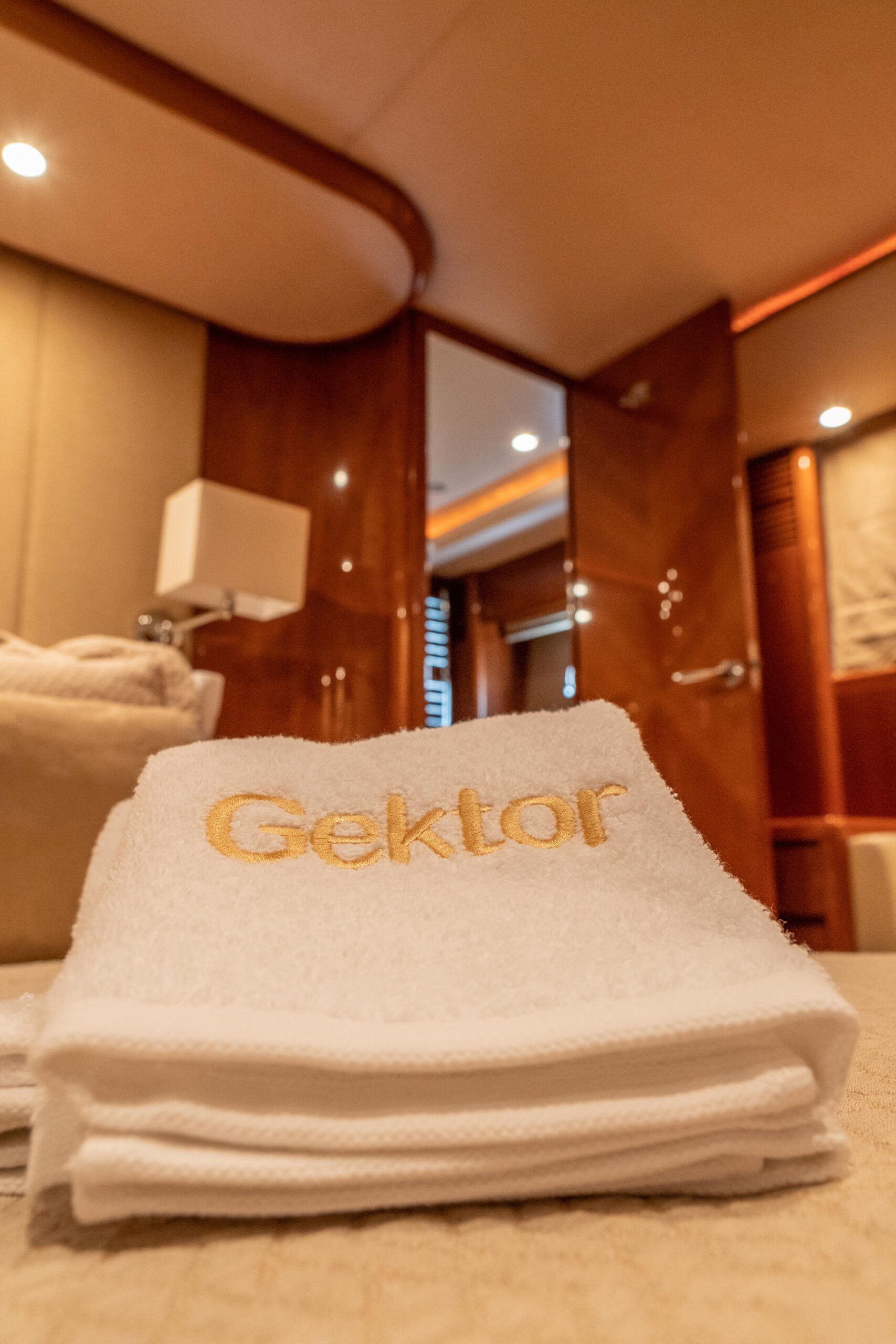 NOTABLE FEATURES OF GEKTOR: ~Hard roofed flybridge ~Comfortable deck furnishings ~Timeless interior ~Split level main salon ~Selection of water toys ~Air conditioning ~WiFi