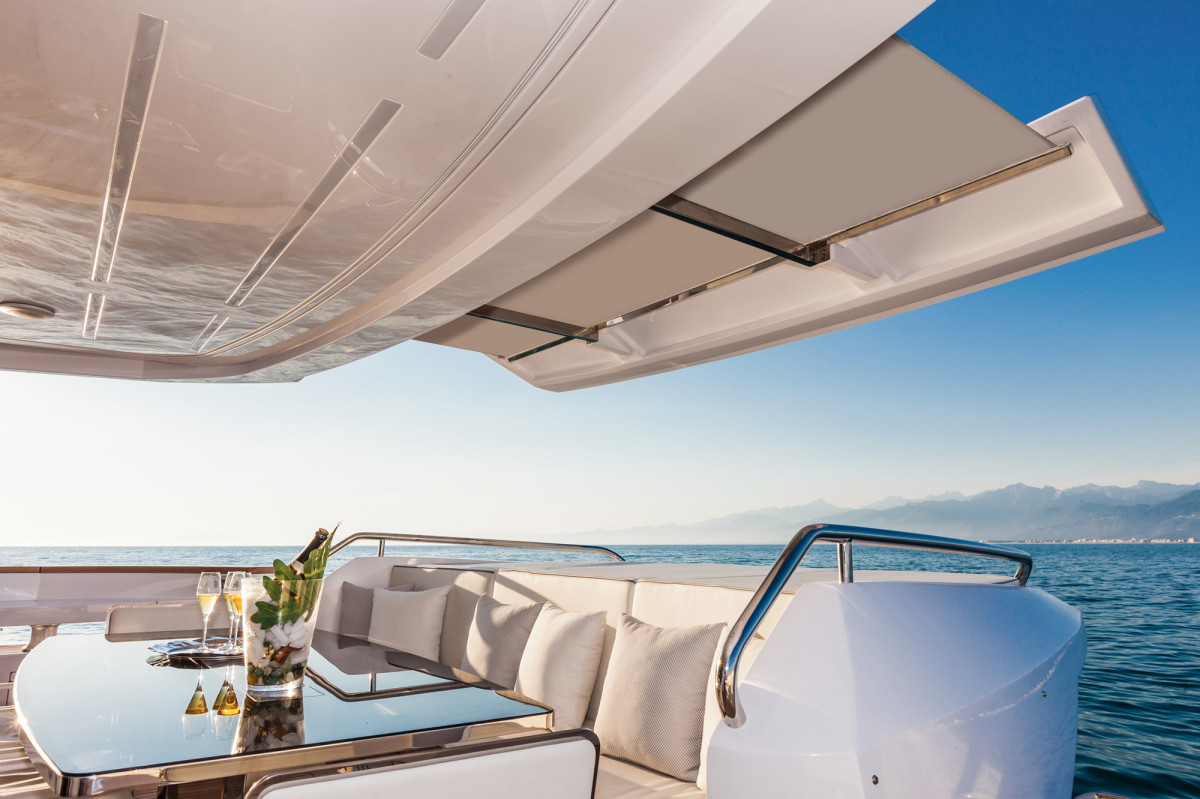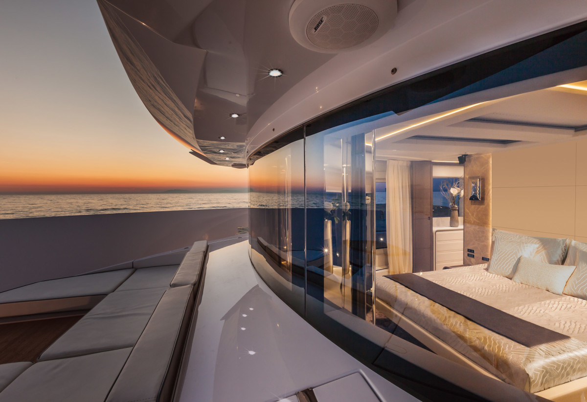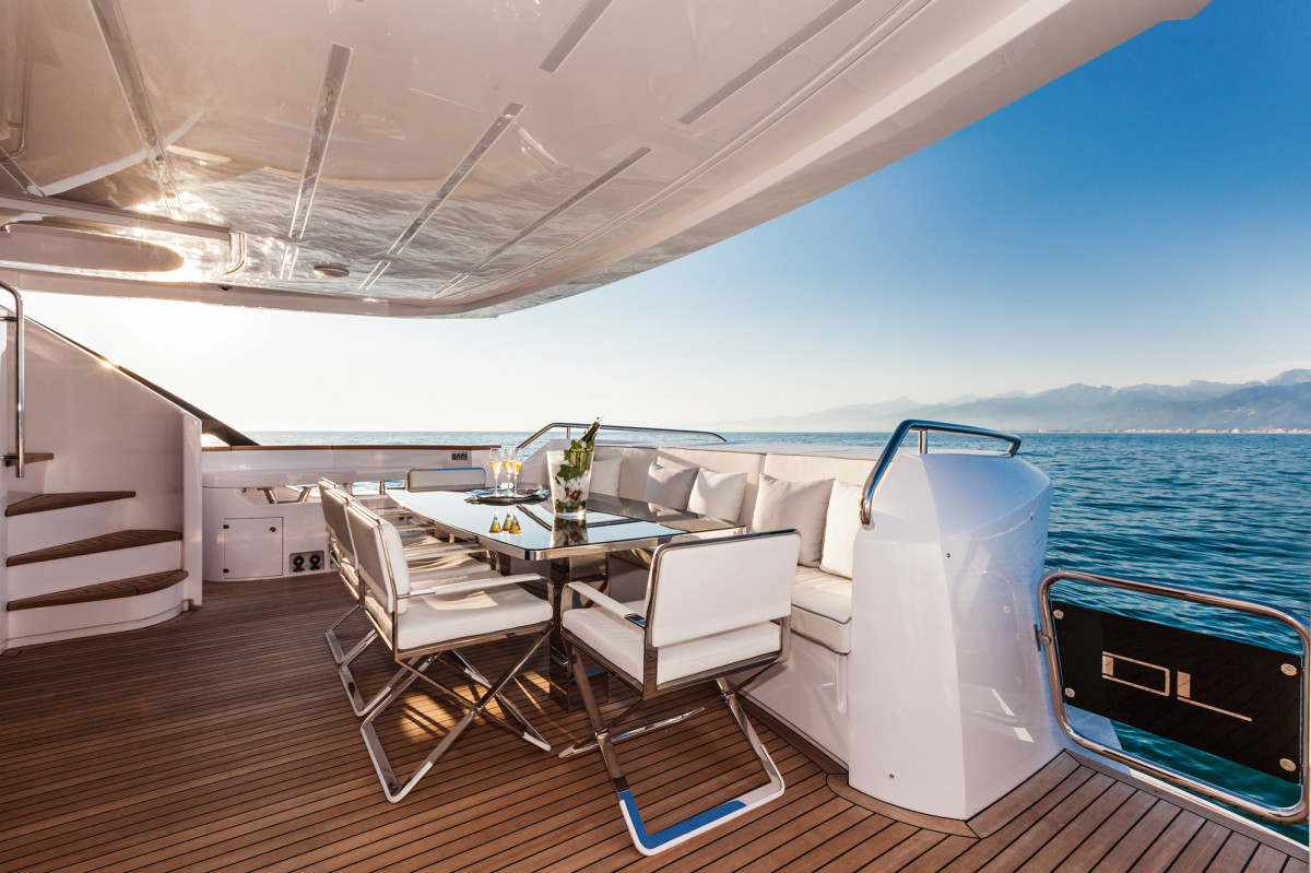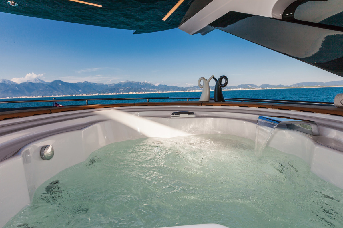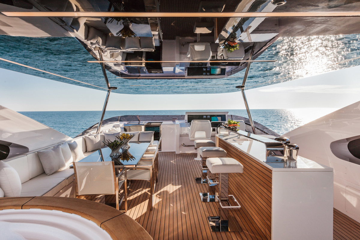 The main deck aft provides an elegant alfresco dining area, with stairs providing easy access down to the hydraulic swim platform for easy access in and out of the water, and side walkways heading round to the foredeck. The bow has sunbed seating that converts into a C-shaped sofa and drinks table to make a versatile space for enjoying some peace and quiet in the sunshine. The flybridge is accessed either via a starboard stairway from the main deck aft or through the raised pilothouse. This beautiful social space has the wet bar amidships to starboard behind the helm controls, and the alfresco dining area is amidships to starboard beneath the hardtop. The sun-exposed aft is lined with sunbeds, and to port is a raised Jacuzzi for resting in the open air with exceptional views.