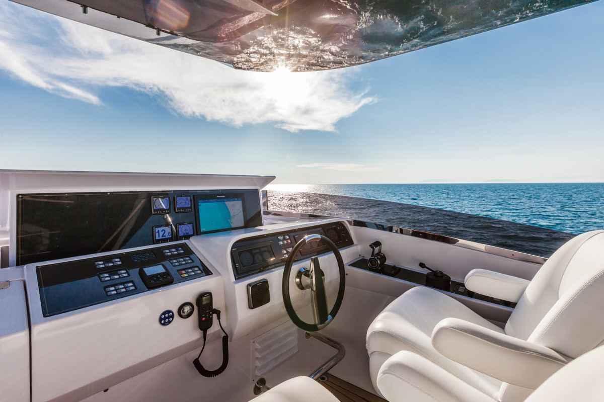 Above is the raised pilothouse, through which guests have access to the flybridge.