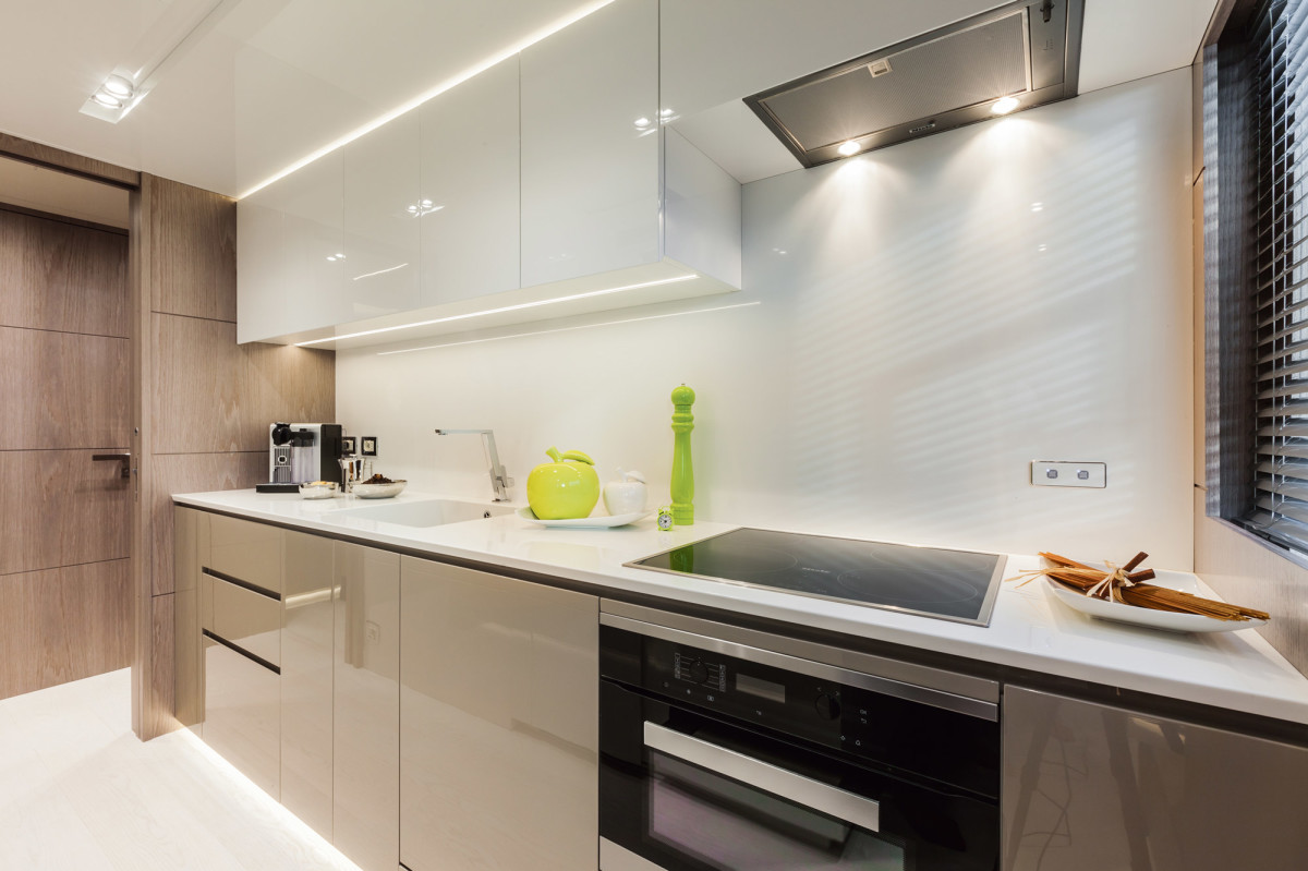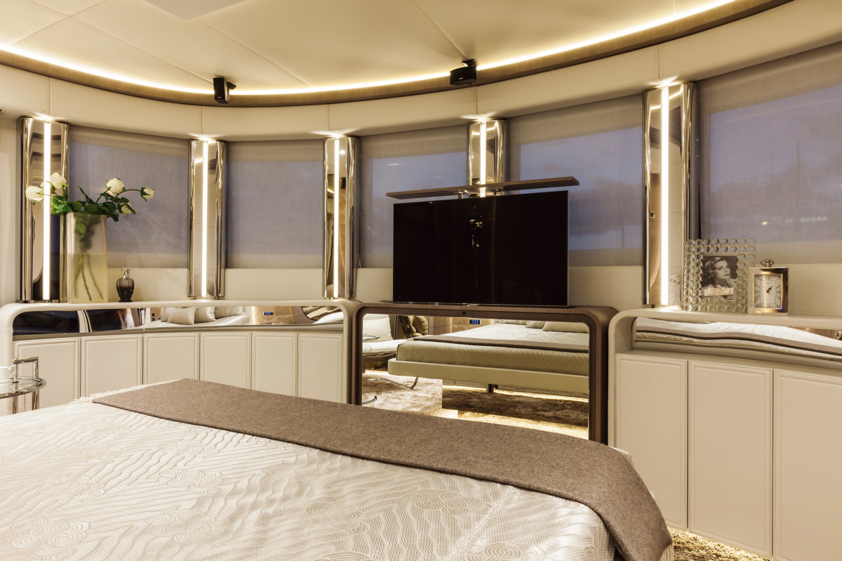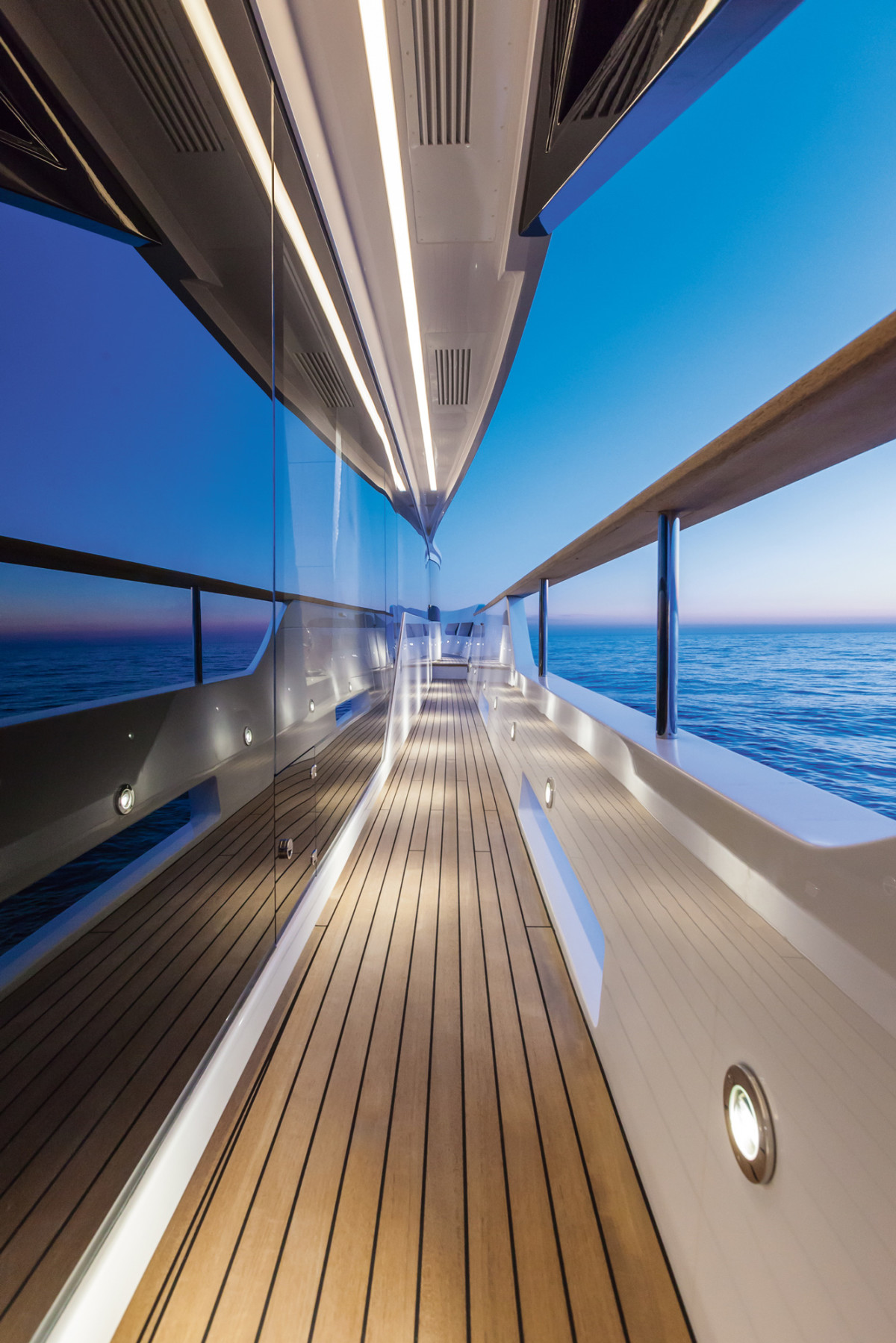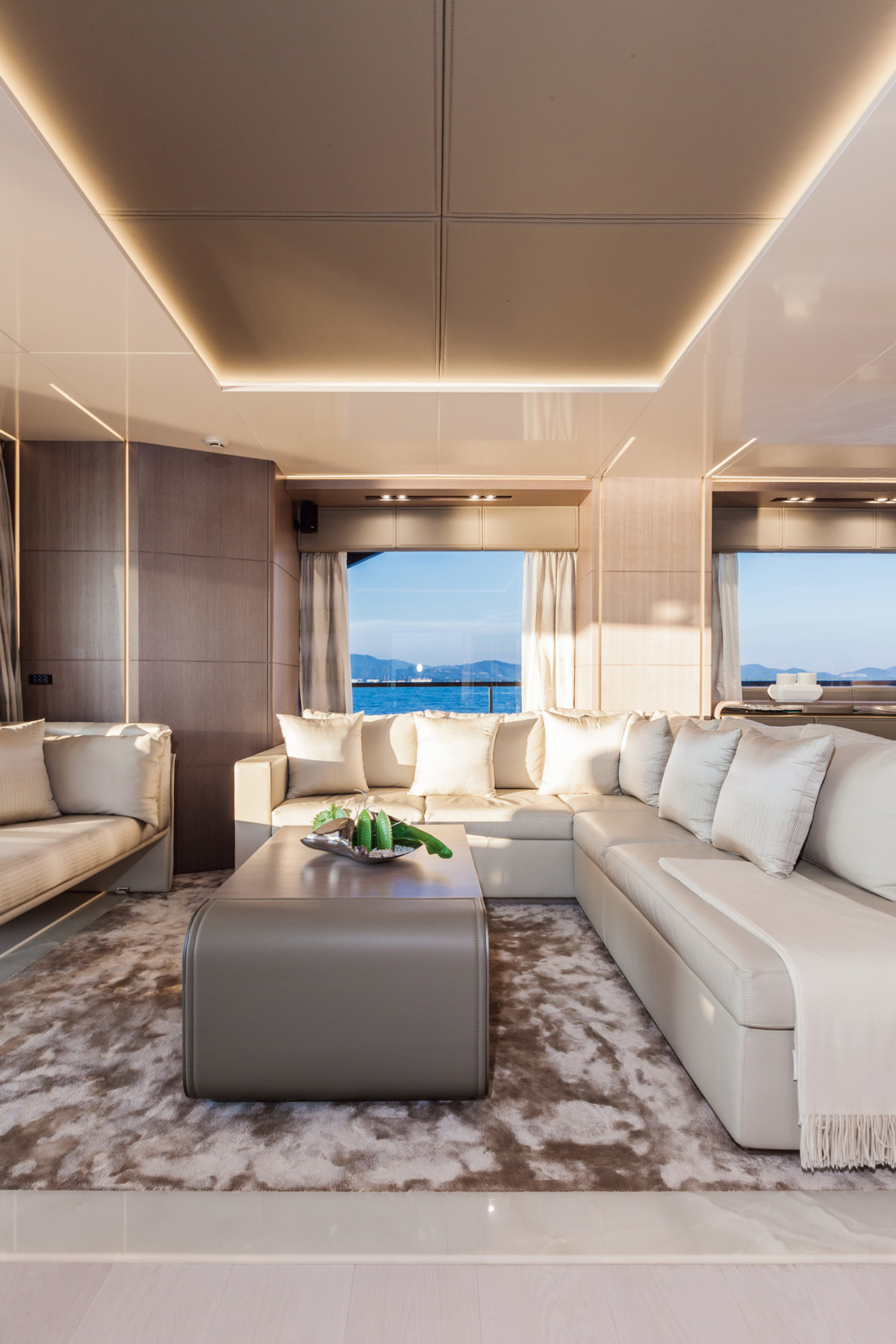 Team 4 Design has created a glamorous and heavenly environment throughout contrasting natural textures and stone grey tones against warm lighting and reflective ceilings to emphasise the sense of space within. The lower deck layout contains the majority of the guest and crew accommodation, with the Master suite forward on the main deck. Behind is the galley and main foyer, with the formal dining area