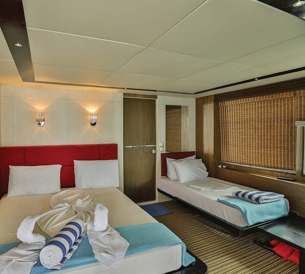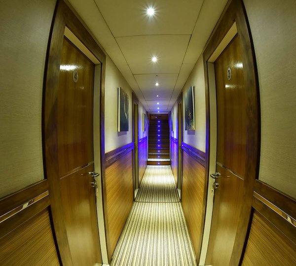 The luxury charter yacht HONORS LEGACY is able to accommodate 18-22 guests in 9 cabins. There are 6 Staterooms located on the lower deck and 2 Oceanview Suites with bathtub located on the bridge deck. All cabins are air-conditioned with gorgeous interiors and trendy fittings, en-suite bathrooms with fresh hot and cold water, mini bar, safe and Full HD TV with DVD players.