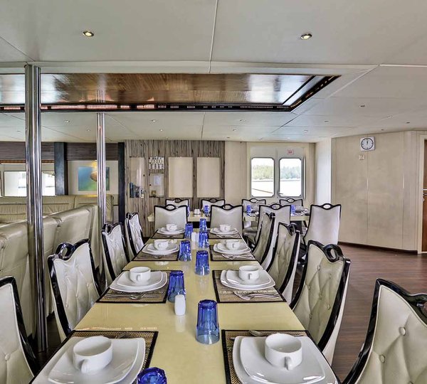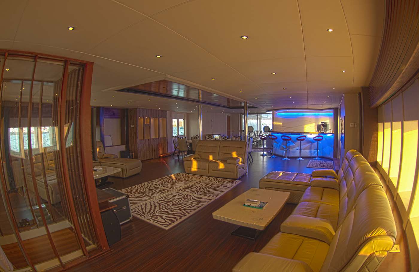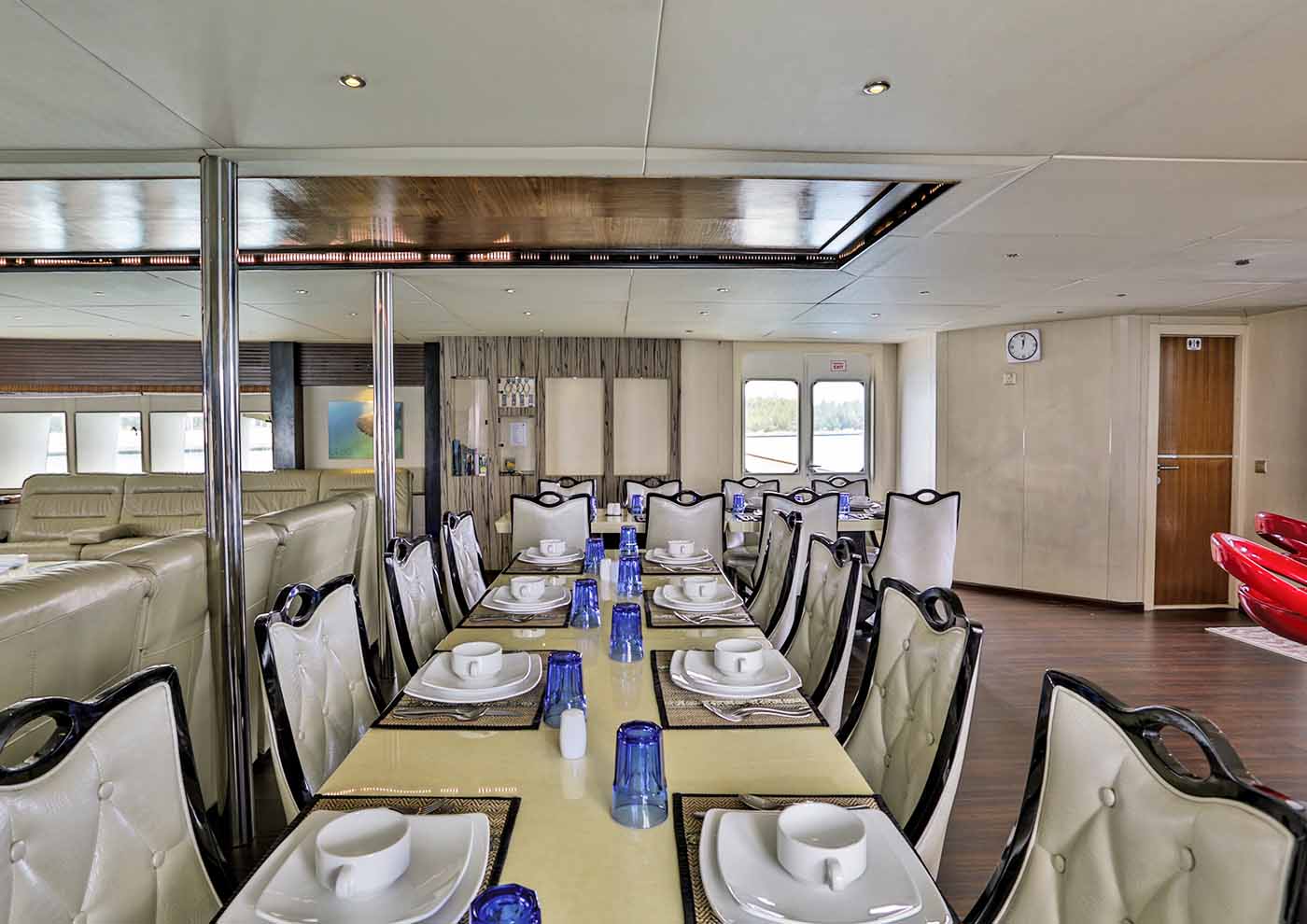 M/Y HONORS LEGACY has outdoor and indoor dining facilities with the trendy marble tables and genuine leather chairs offering a cozy environment in the air-conditioned saloon. The dining area at the aft end of the main deck enables you to get the spectaculars views of the Maldives. Buffet style breakfast, lunch and dinner including international and local cuisines are prepared onboard.
