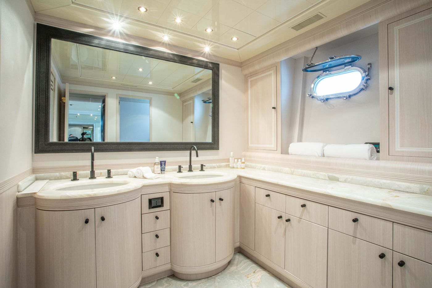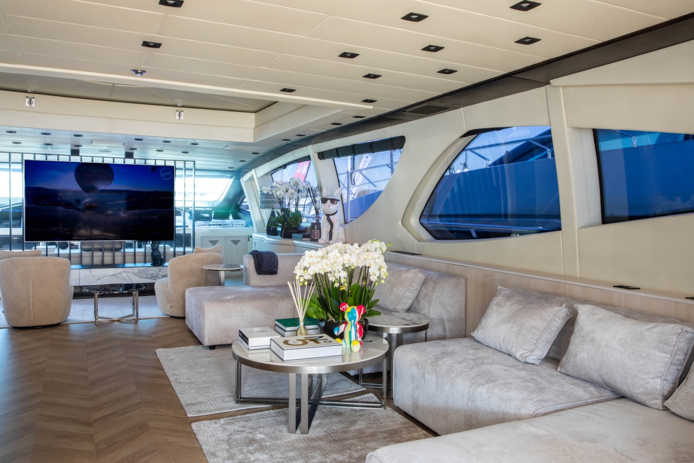 Her raised salon and open plan dining is spacious, light and ideal for gathering with family and friends. The decor is a combination of rich tones and crisp whites, with the lounge aft and formal dining forward.
