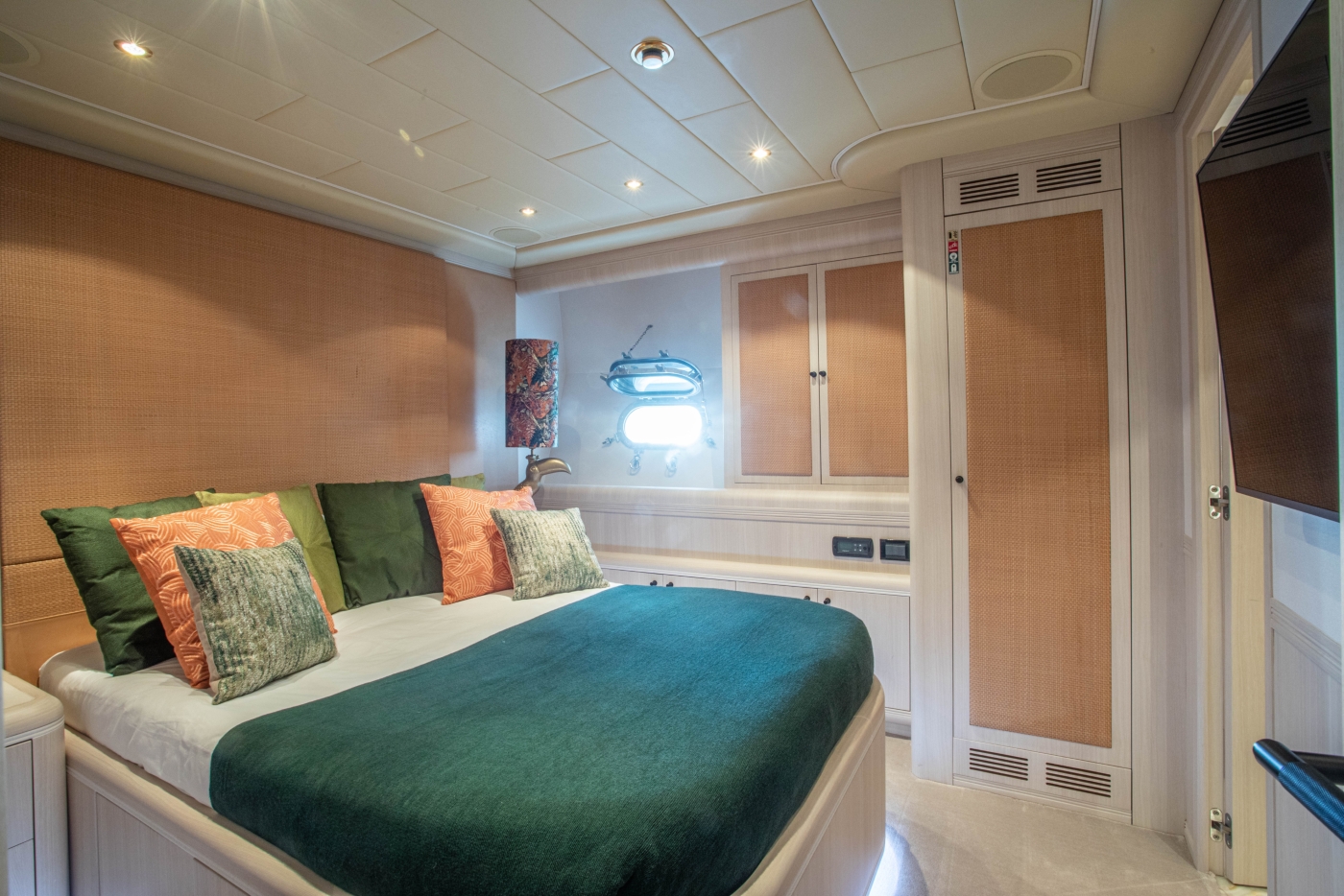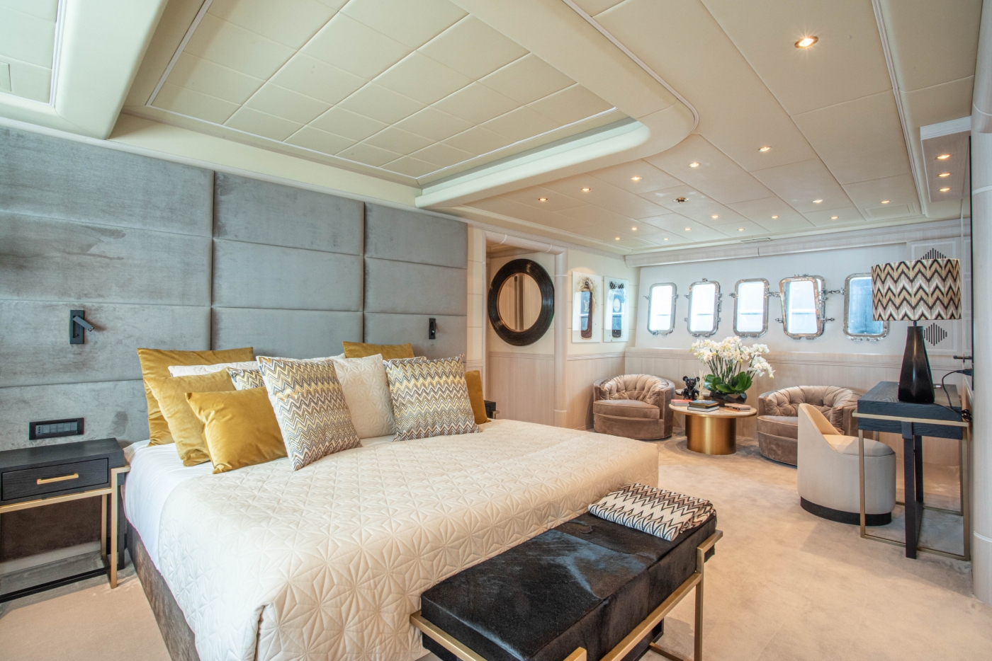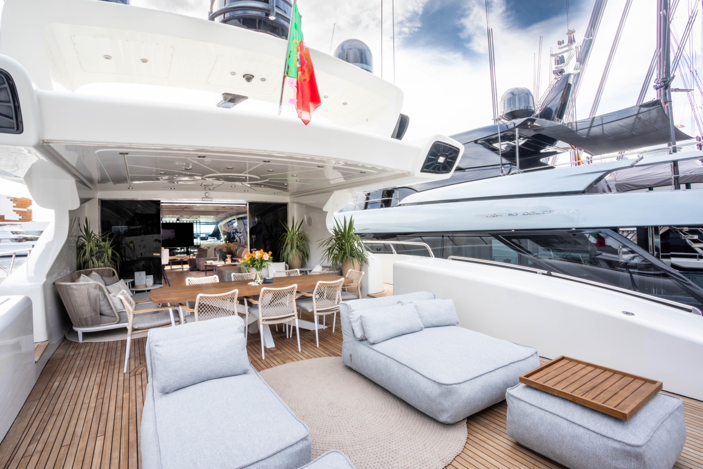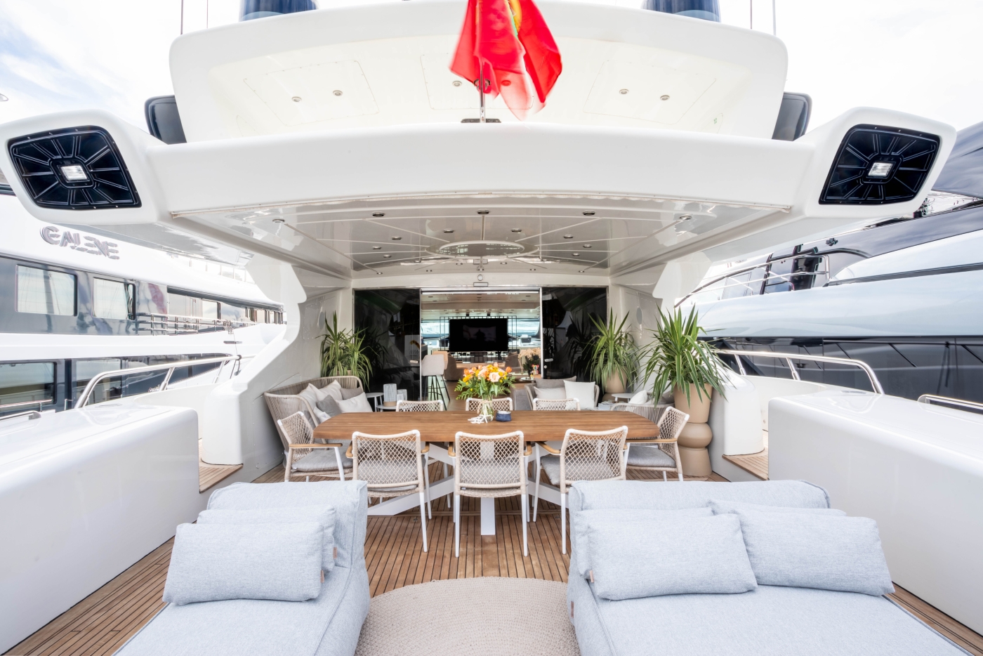 Outdoor living is well-appointed, offering a generous aft deck, alfresco dining, large sun pad, and cocktail bar. On the foredeck, there is a further sunning area.