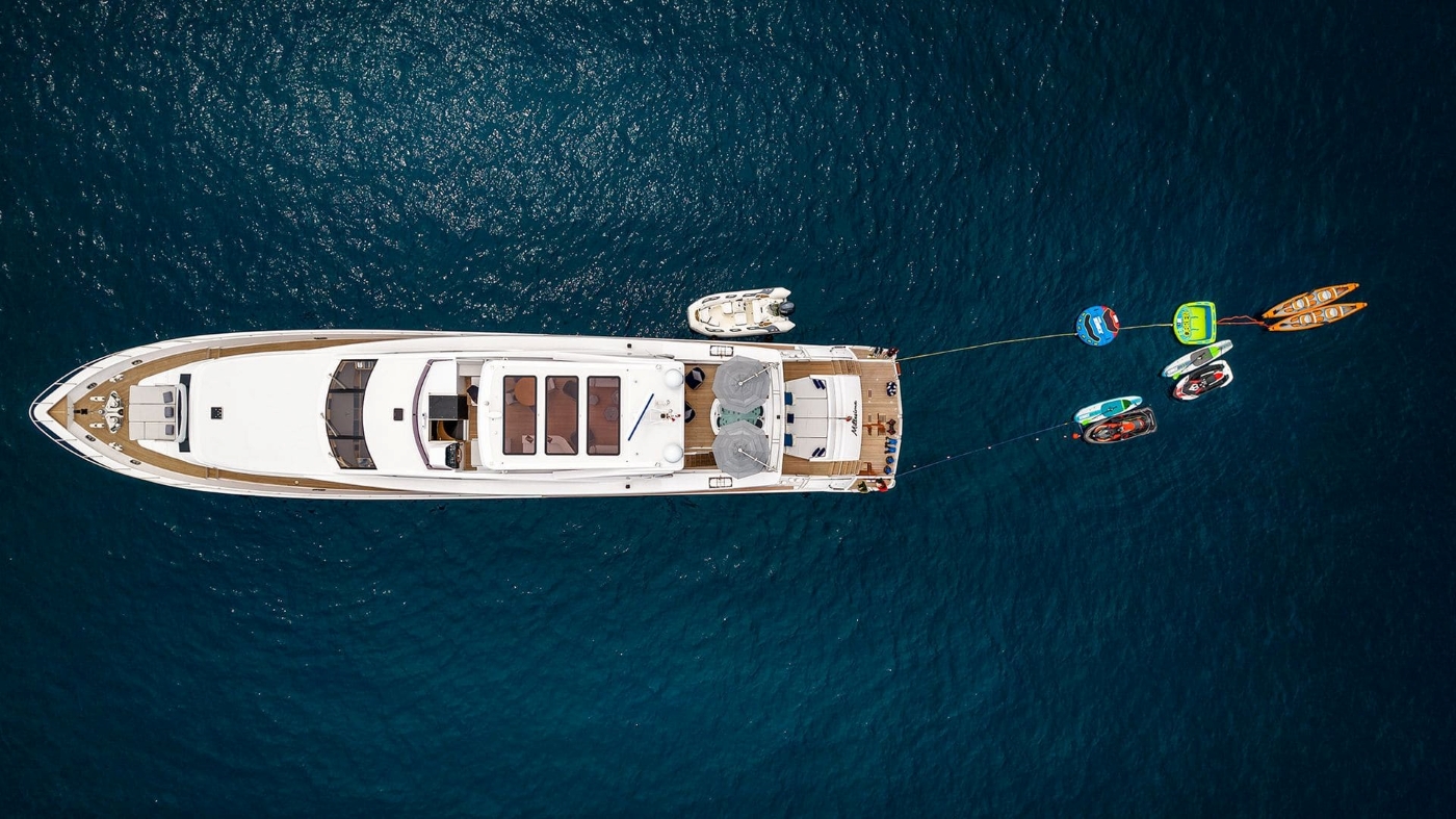 Tender & Toys ~Chase boat: 9.50m AGAPI with two ~Yamaha 300hp engines ~Sea-Doo RXP 300 ~Sea-Doo Spark Trixx ~Flyboard ~Seadoos seascooter x 2 ~Wakeboard ~Water skis ~Kayak x 2 ~Paddle x 3 ~Beach club ~4 seater towable boys ~2 seater towable Donut ~Snorkeling gear