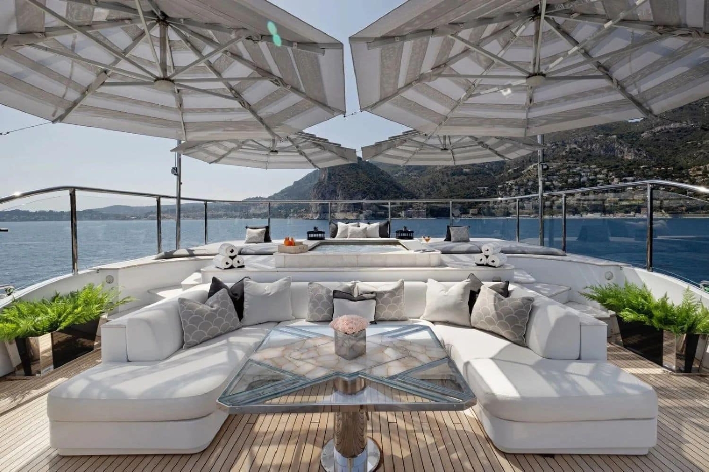 Outstanding deck spaces in a neutral palette have furnishings custom-made to a remarkable level of attention to detail.