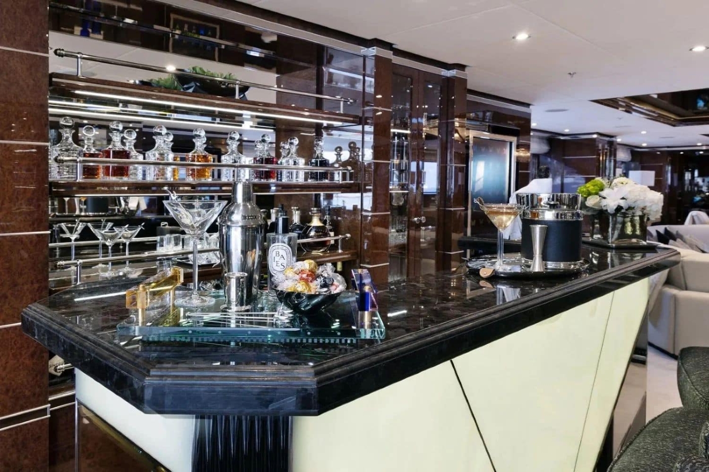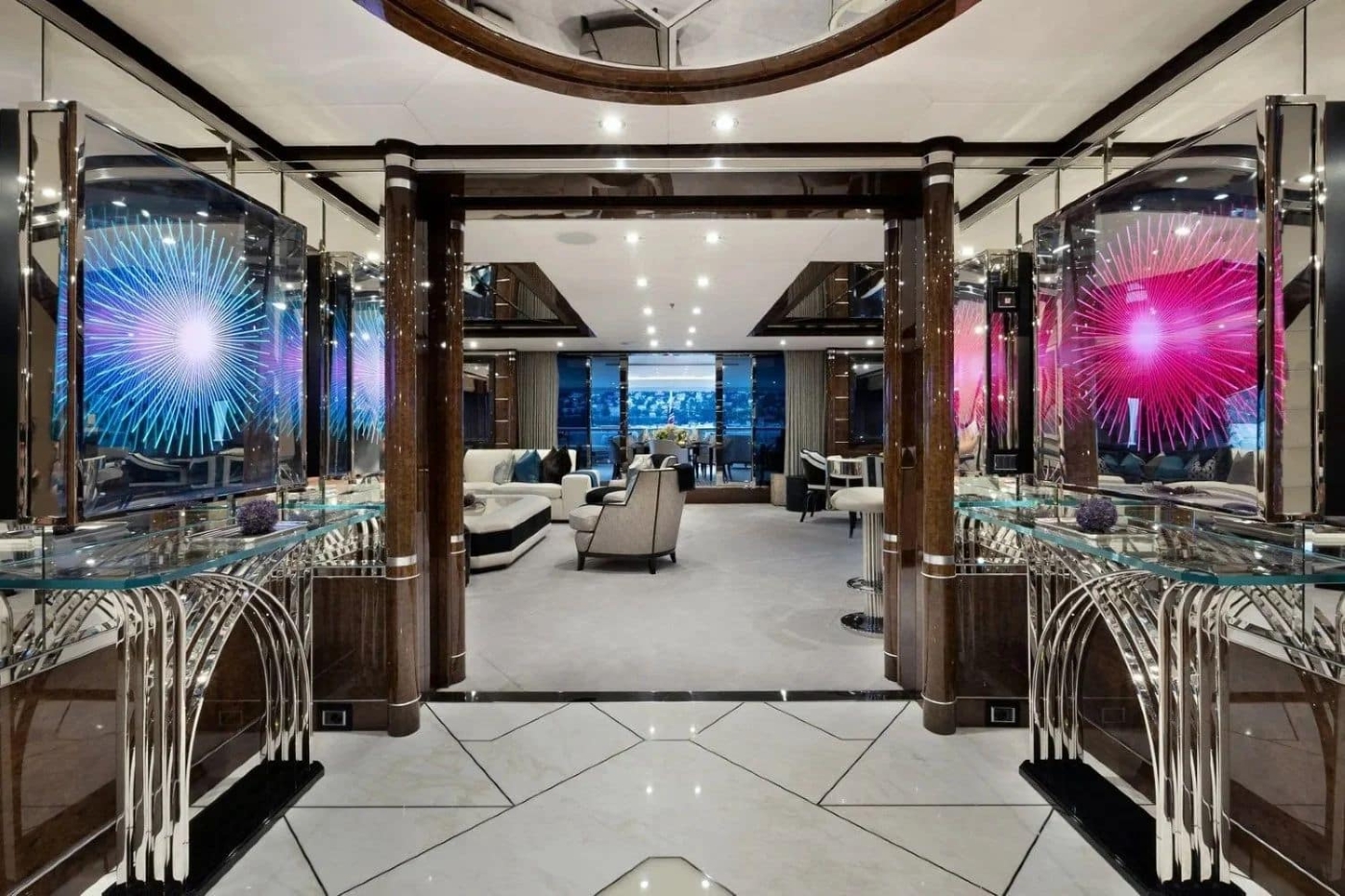The Art Deco-inspired interiors are accented by bold artworks, polished stainless steel finishes, bespoke chandeliers and flawless Italian marble, complemented by comfortable custom furnishings. Style meets relaxation.