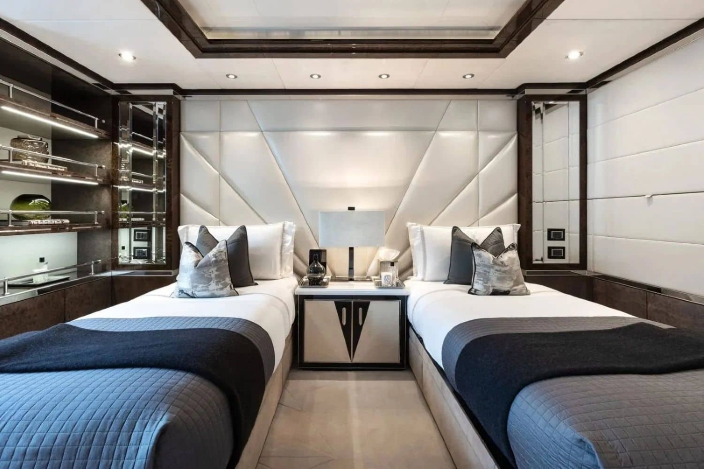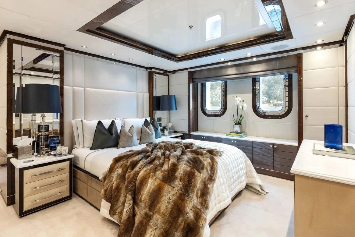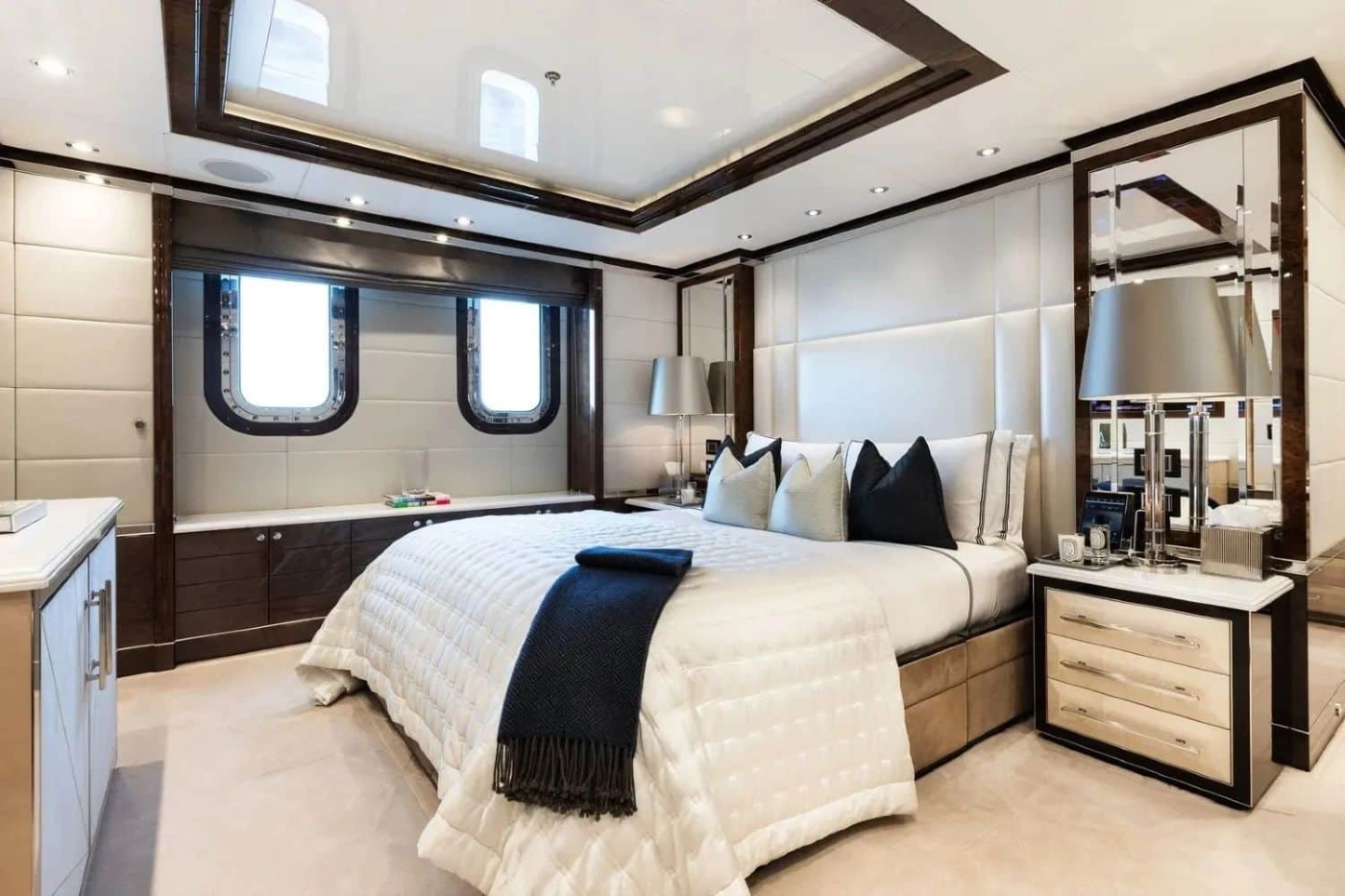 The full-beam main deck VIP suite with an adjoining study/powder room and a large walk-in dressing area is fitted with six full-height portrait windows that flood the space with natural light.