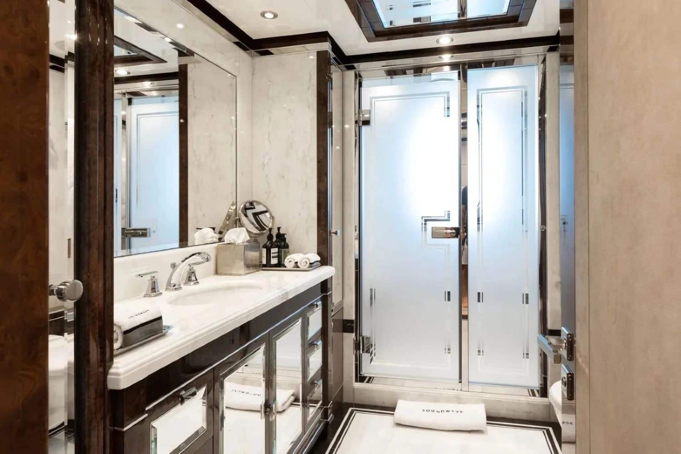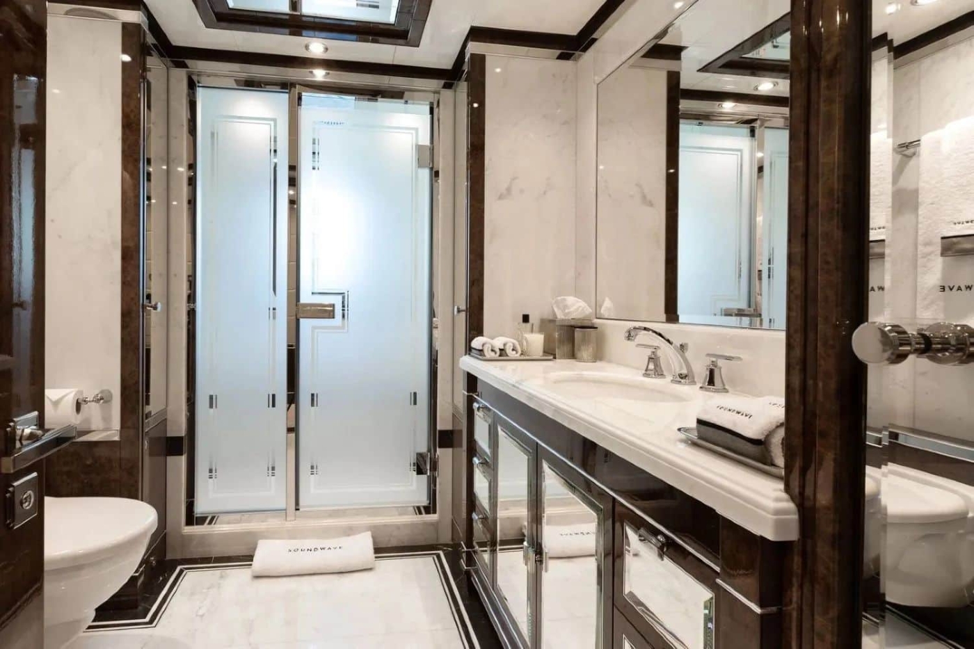 The superyacht SOUNDWAVE has a spacious and elegant master suite on the upper deck with a walk-in dressing and powder room and expansive 180-degree views overlooking an entirely private sundeck with a jet pool and sunbathing area that stretches all the way to the bow.