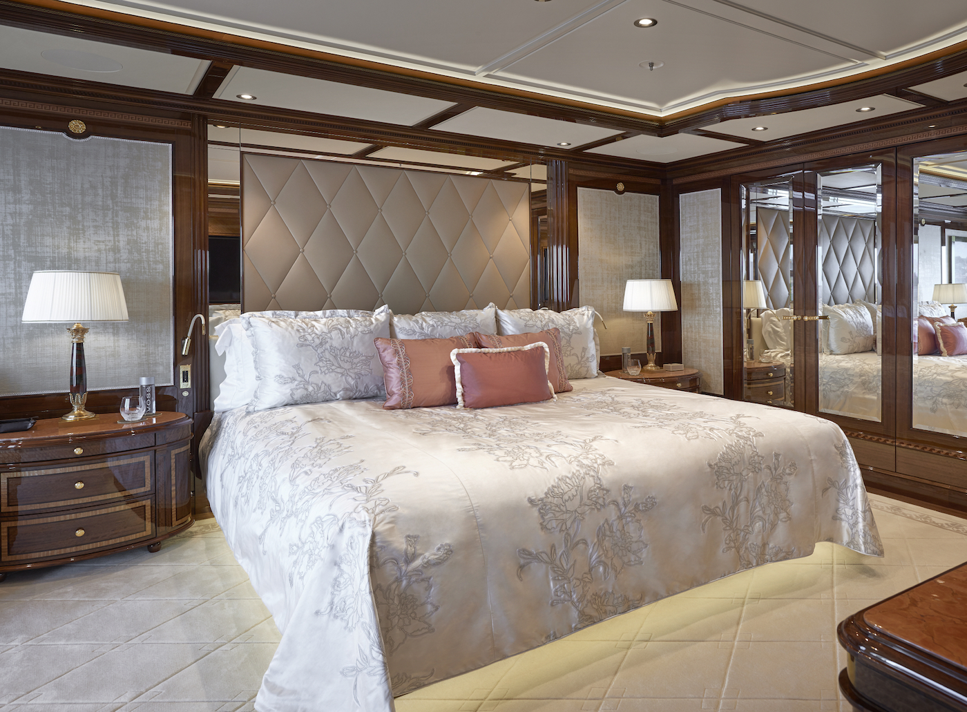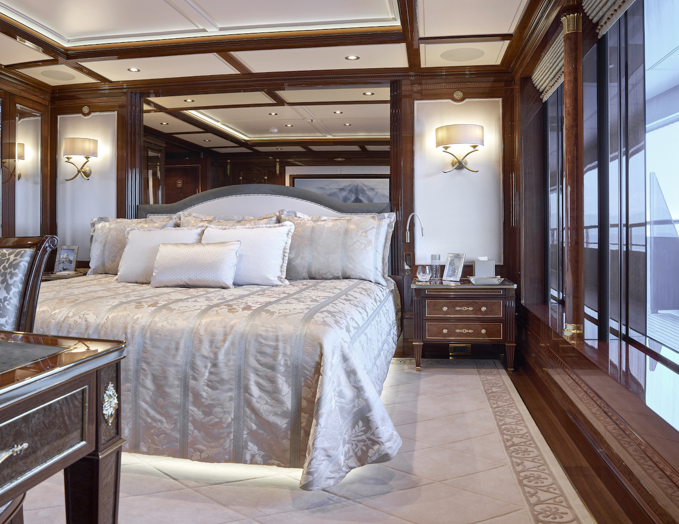 The accommodation sleeps a maximum of 16 guests over 8 en-suite cabins: 1 Master suite, 1 VIP stateroom, 5 double cabins and 1 twin cabin. ~ The Master suite is placed forward on the Owner's private deck and benefits from other amenities such as a slightly recessed tub in the en-suite bathroom, an office with an over-stuffed armchair and a hand-painted map on the ceiling, a beauty salon and gym. The salon on this deck is furnished with a piano and there are additional alfresco living spaces. ~ The rest of the guest accommodation is located on the main deck and is named after colour with classic connotations such as emerald' and 'burgundy'. ~ The VIP stateroom uses pastel-pink tones and plush furnishings for a truly palatial feel, made even more spacious by the generous lounge and dressing room in as well as the en-suite bathroom. ~ The crew of 36 will ensure that everyone on board receives the first-class service throughout their stay.