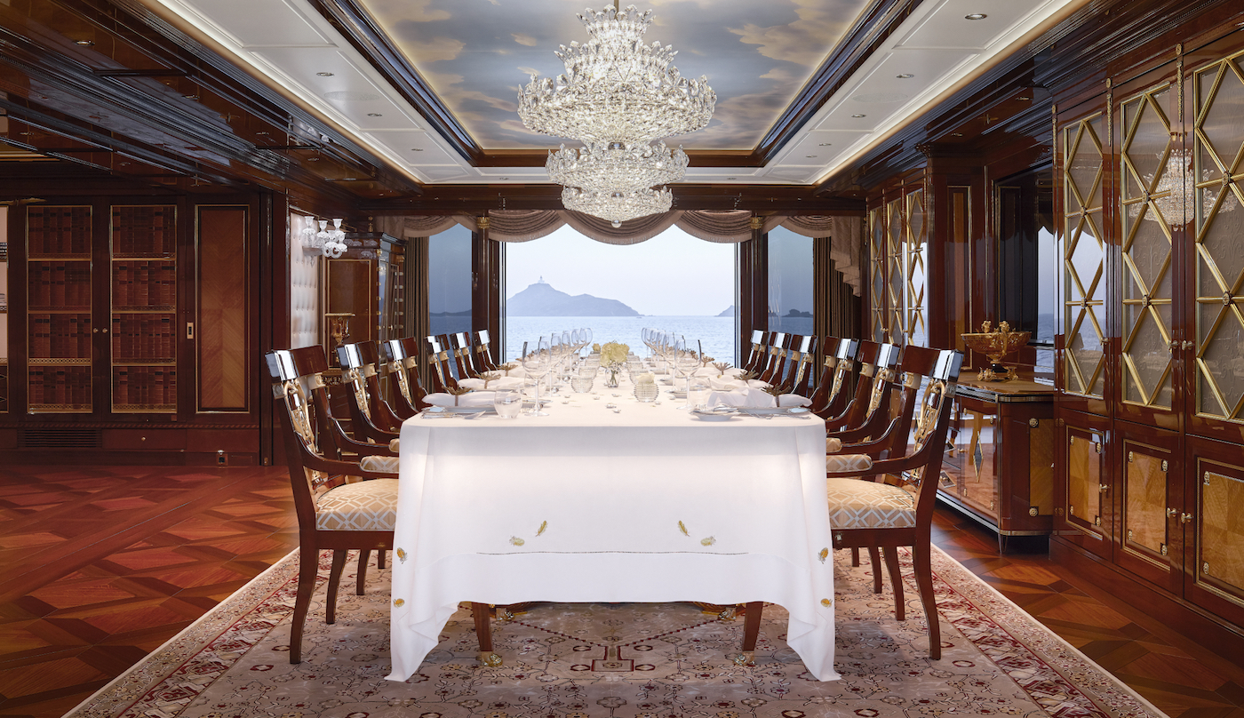On the main deck, guests will find the majority of the guest accommodation forward with the main salon aft providing a formal dining area and plenty of reading material along the walls, and a hand-painted Pleyel grand piano for live entertainment. Classic detailing can be found throughout, such as the hand-painted clouds above the dining table and the back-lit bar has a broad selection of spirits with the most impressive bottles that coordinate with the room colour scheme receiving pride of place.