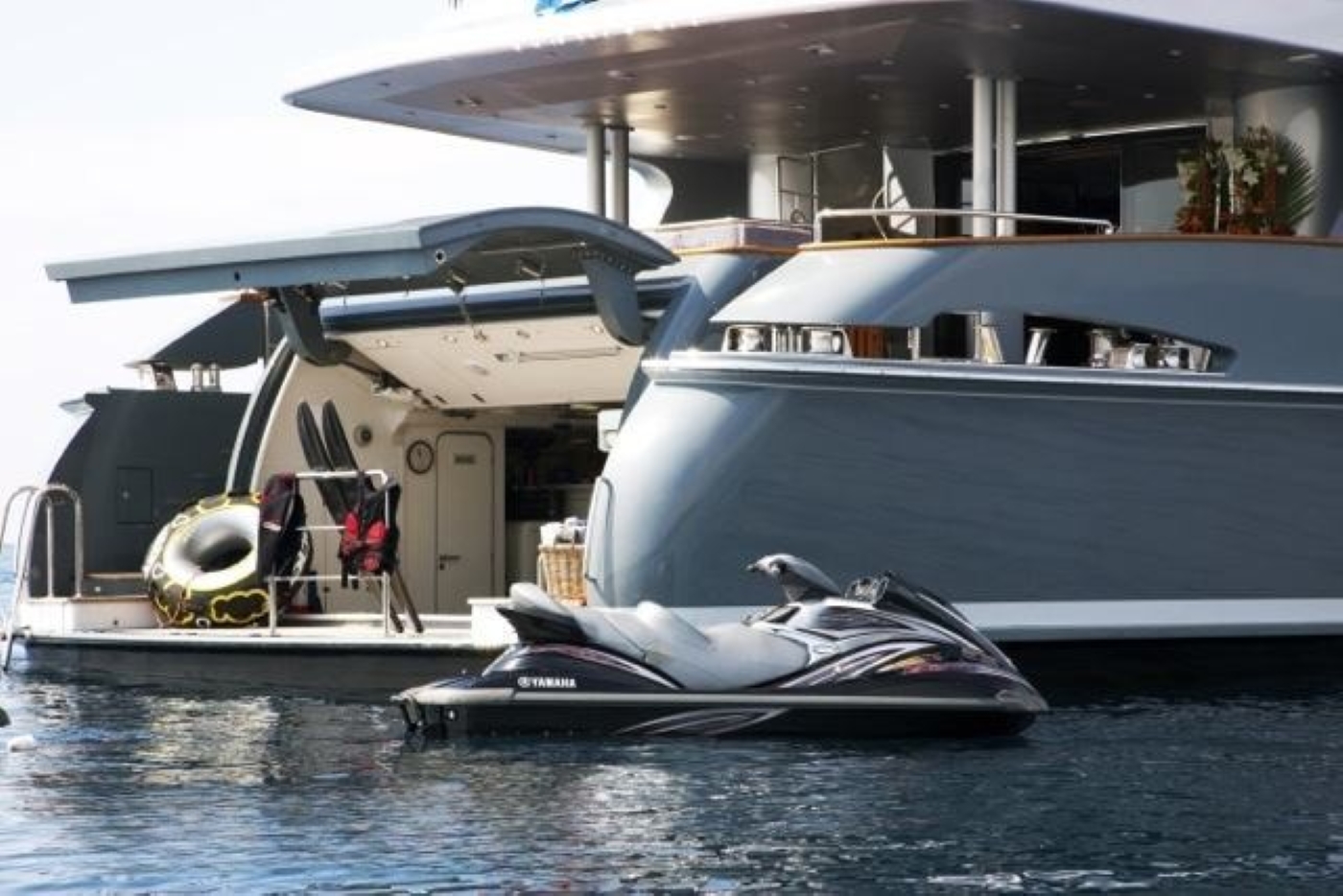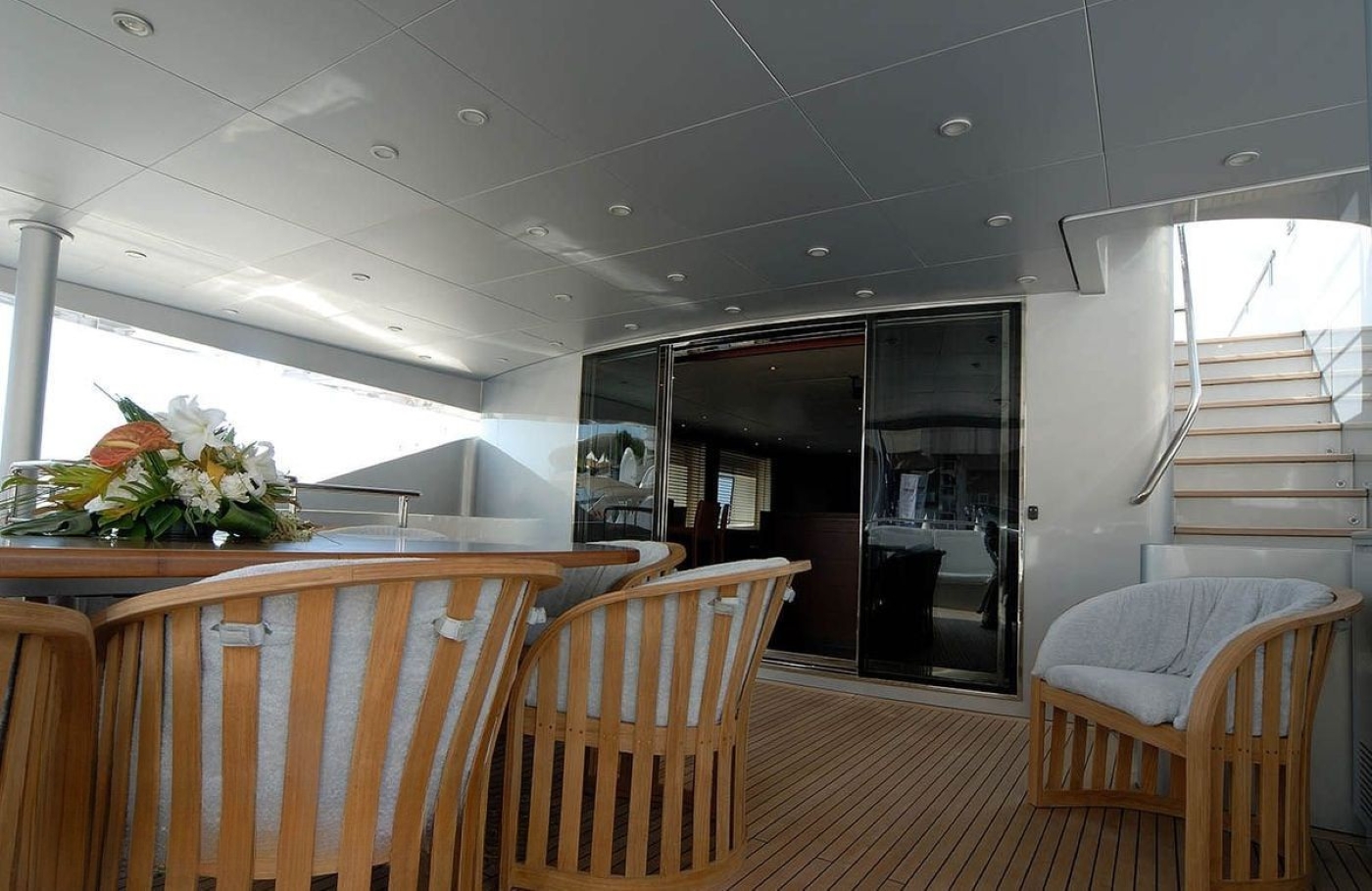 Motor yacht ANNAMIA also boasts spacious and well thought out exterior decks. Her aft deck is equipped with a large table for al fresco dining, a sofa and 2 armchairs, and is a perfect quiet place to enjoy breakfast while discussing the exciting plans for the day. From this deck, you can access the swim platform to ride the tender or to enjoy the water sports.