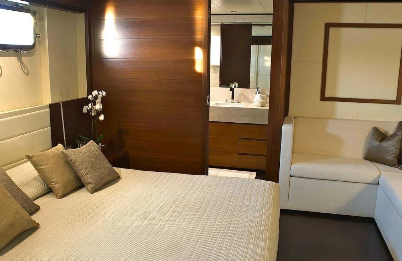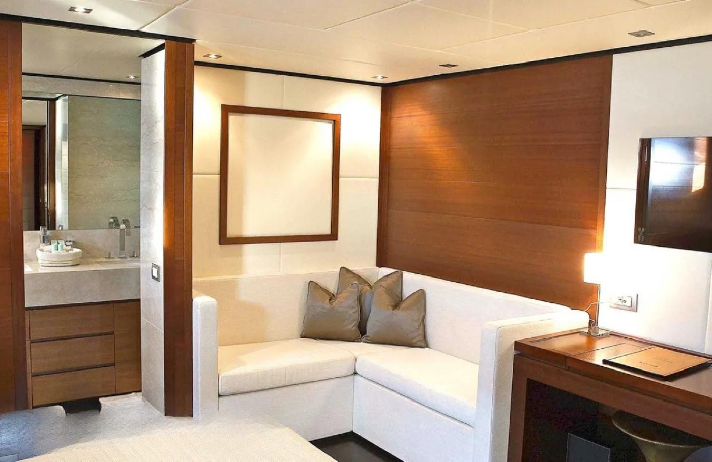 Superyacht ANNAMIA’s Master cabin, located on the main deck forward, includes a private access, an office, a dressing and a bathroom with spa pool and hammam. Wide windows on both sides of the yacht offer a unique view.