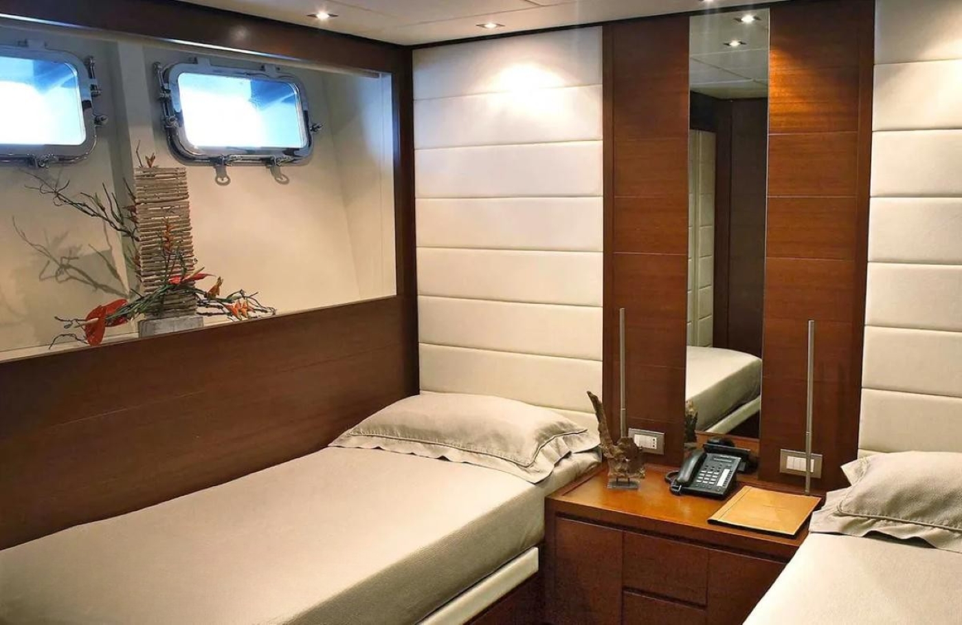 The remaining cabins are located on the lower deck accessed from the main deck via wide modern stairs. There are two spacious VIP cabins with double bed and two twin cabins with two single beds and possibility of a third one for a child. All cabins have a bathroom and separate audio-visual systems.