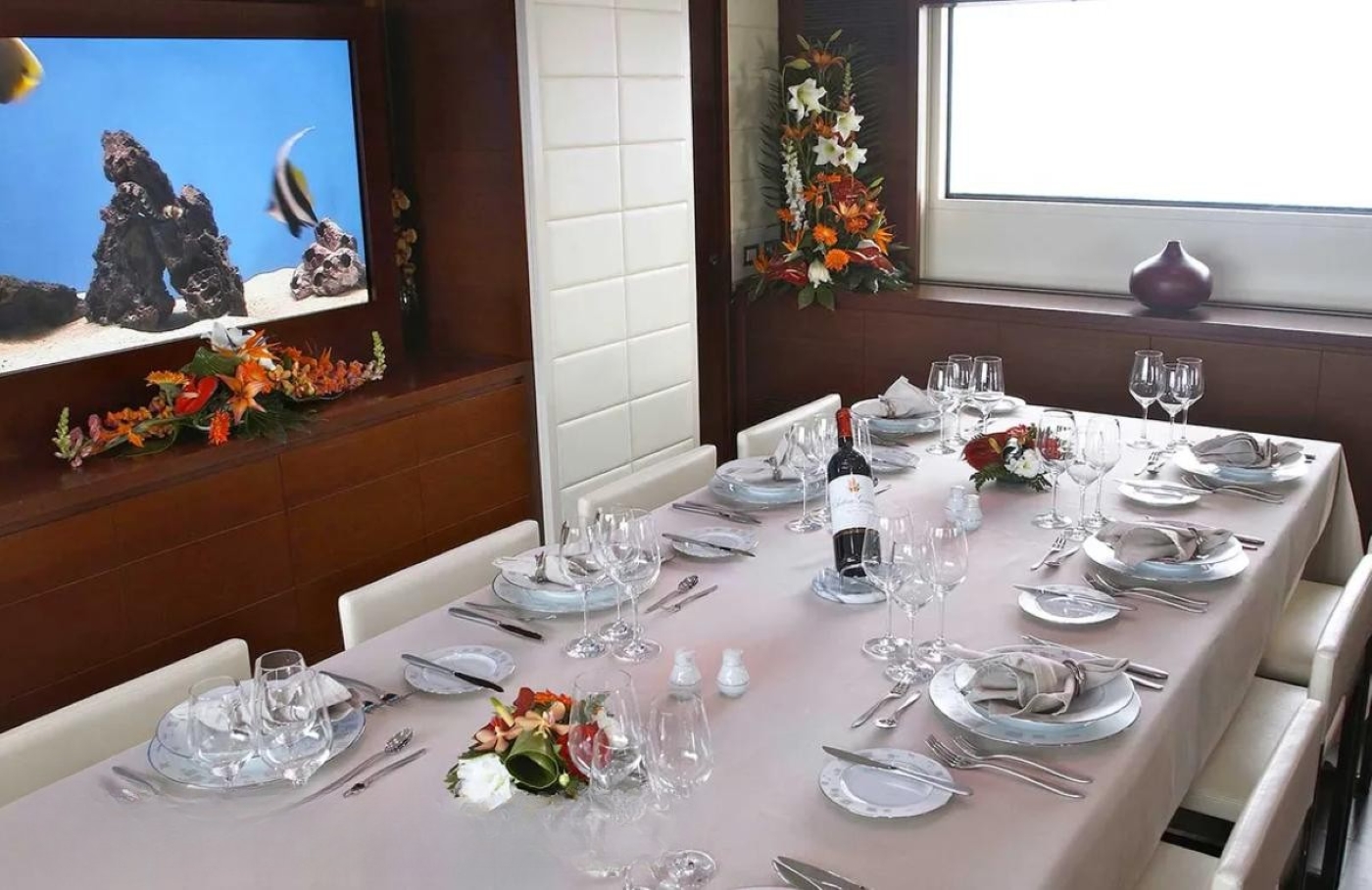 ANNAMIA boasts a unique and stylish grey hull along with changing colours of her metallic structures. After sunset, the LEDs offer a wide range of colour lighting effects to suit the mood.