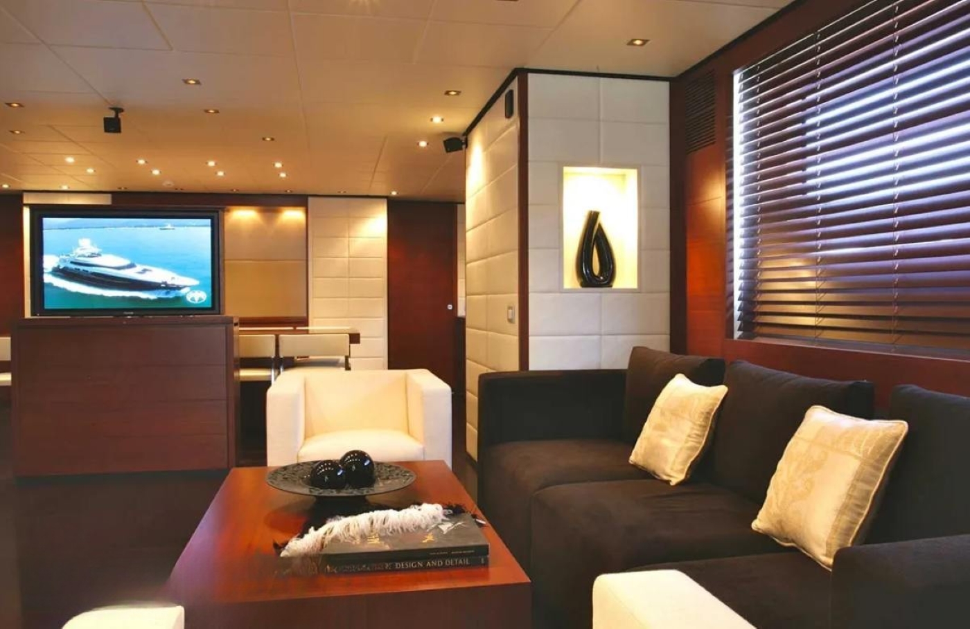 The ANNAMIA motor yacht has a beautifully fitted interior. Her main salon offers a living-dining area on the main deck and provides a feeling of rare spaciousness and depth with the harmonious, modern and smart decor. The combination of wenge and beige leather creates a comfortable atmosphere and the lighting provided by Leds creates various colours to suit the occasion.
