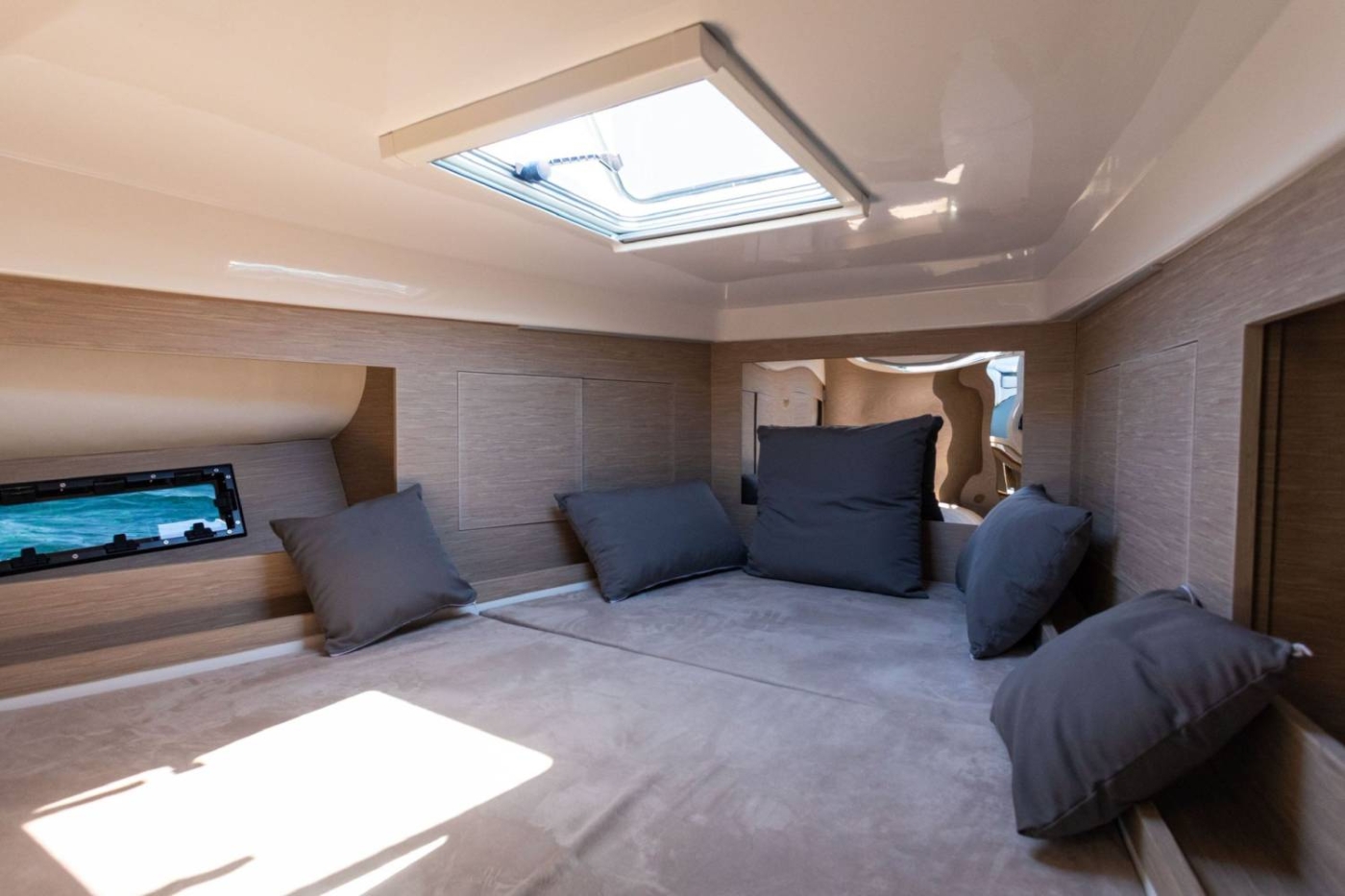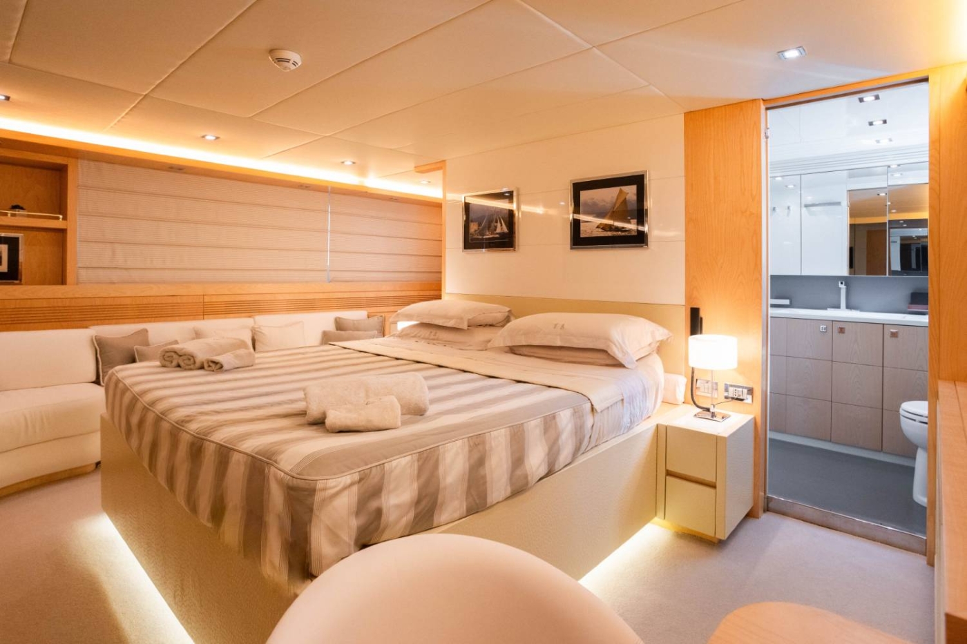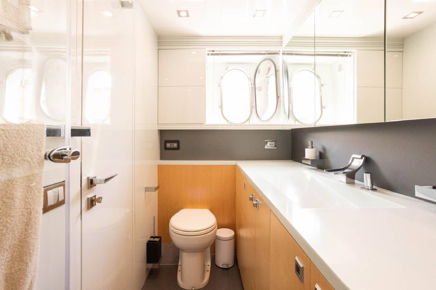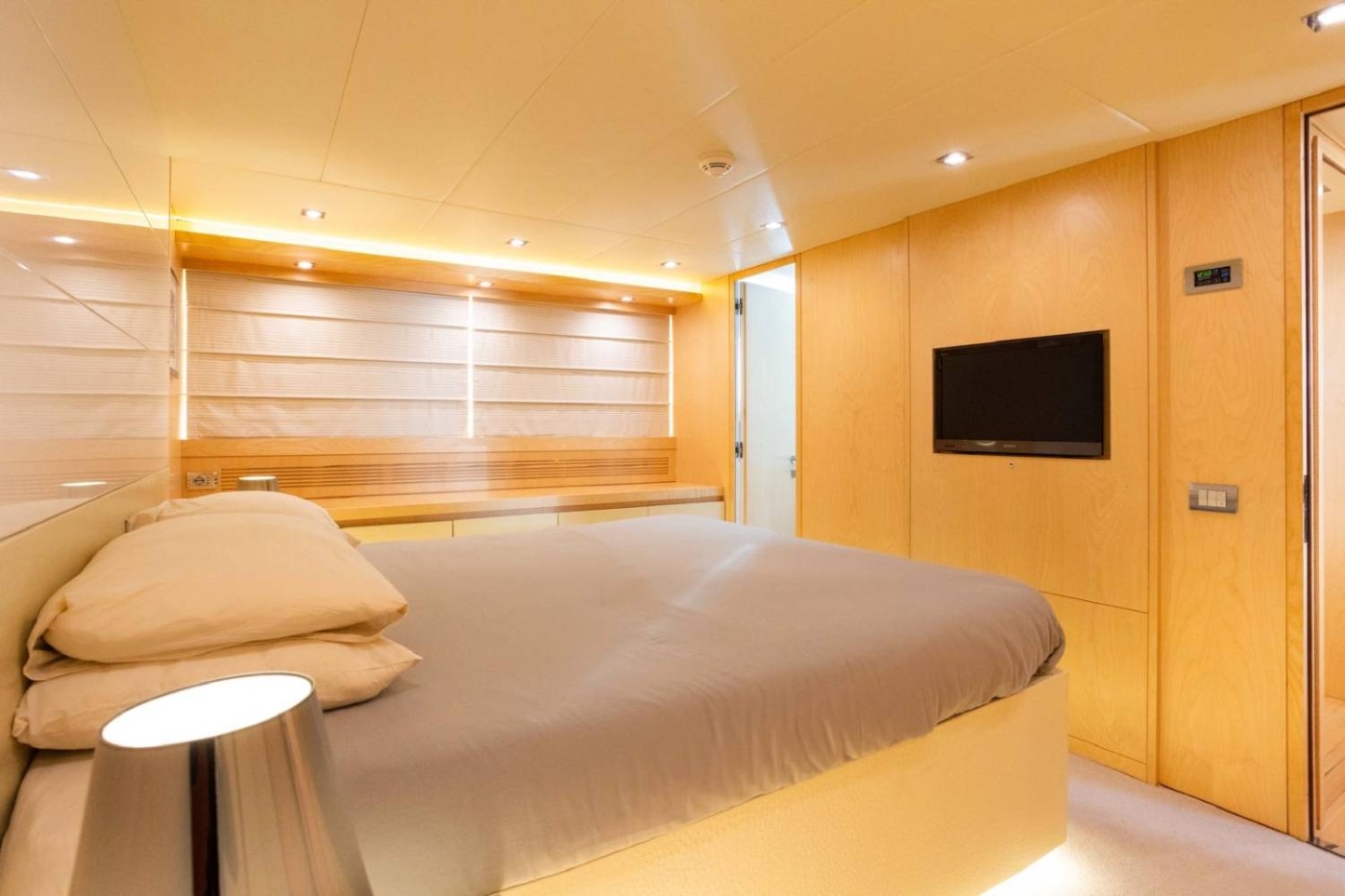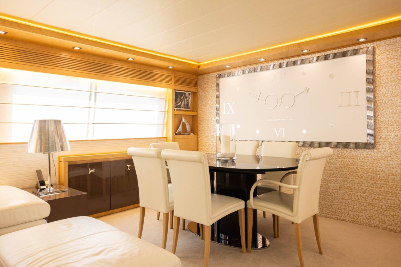 The striking Maiora 27 luxury yacht ANTARAH provides elegant and spacious accommodation to up to 9 guests in 4 well-appointed cabins, including a master cabin, one VIP cabin, and one double cabin with a Pullman berth and one twin guest cabin. Light colours predominate in the interior, with birchwood panelling and a large white sofa welcoming the guests in the saloon, which also promises to entertain with its TV screen and a dining table capable of seating up to 12 guests.