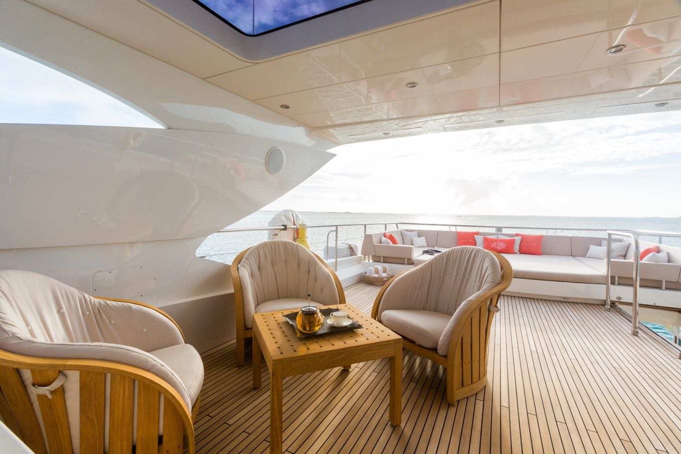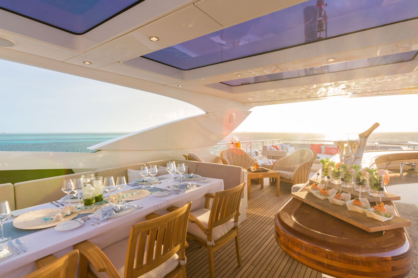 The yacht has plenty of exterior living space to offer. The aft deck is adjacent to the salon through glass doors. Partially shaded, the deck offers an alfresco dining option, additional seating/sun pad and access to the extended swim platform and water toys. Forward, the yacht boasts a more intimate double sun pad.