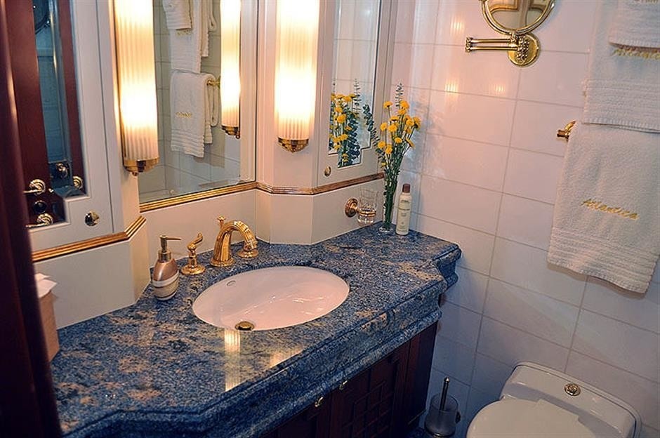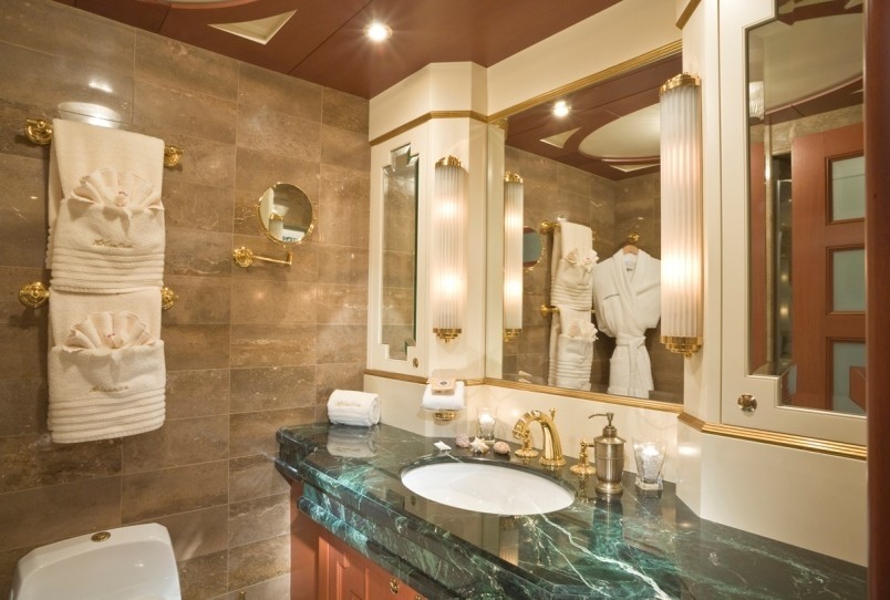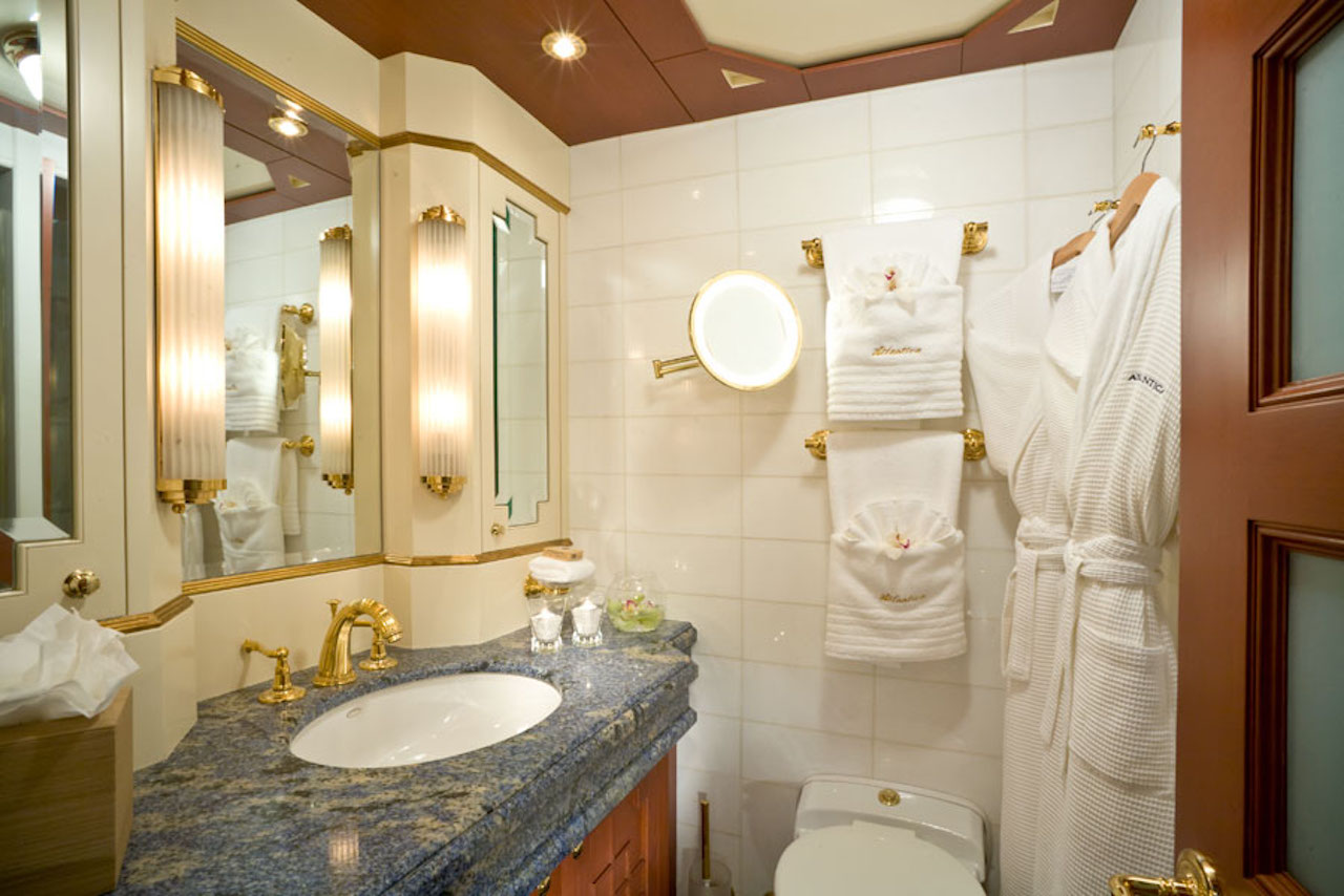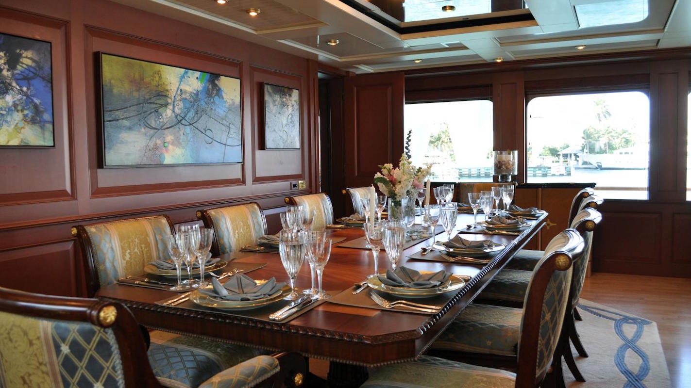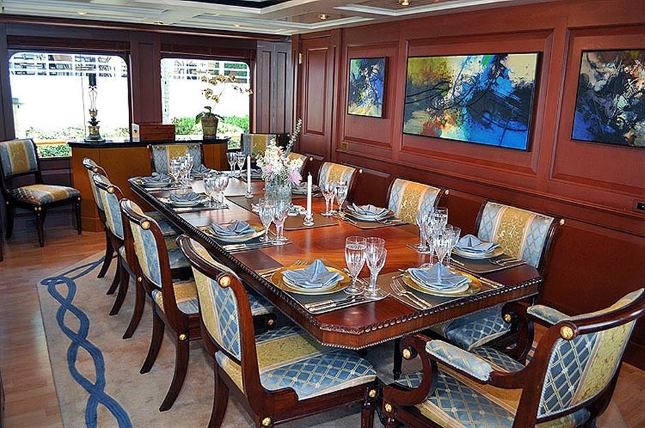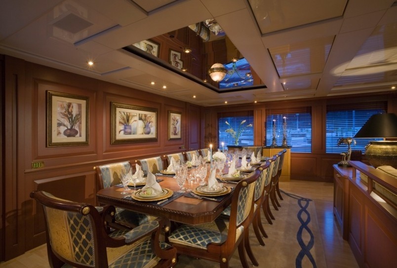 Her main salon is furnished with characteristic rugs and large overstuffed couches with face the pop-up TV and entertainment system. The sky lounge on the upper deck provides another excellent entertainment area including a bar, high-backed couches and a projection-screen with full audio visual facilities including karaoke. The sky lounge looks and feels spacious due to her extension onto the upper deck.