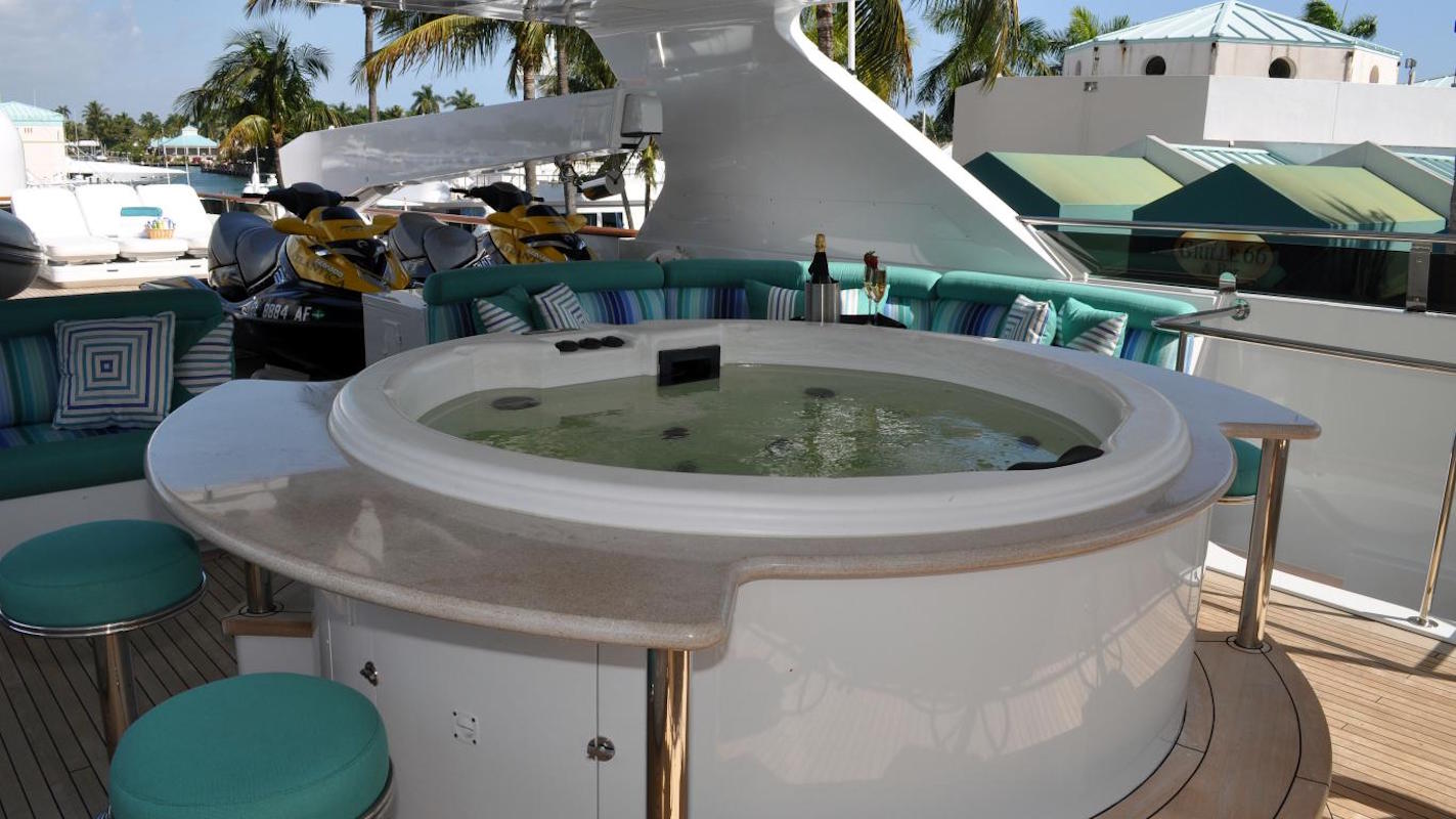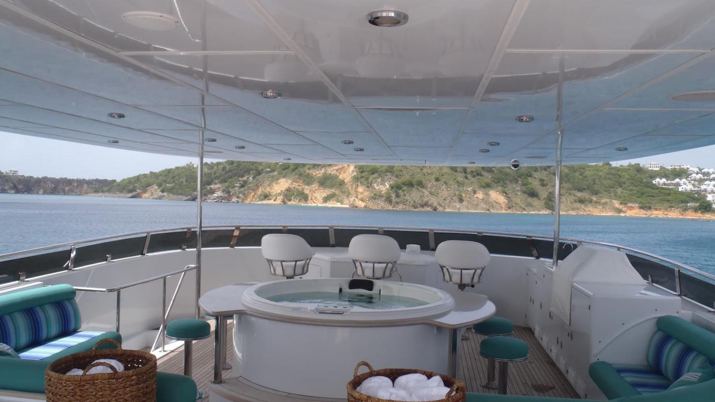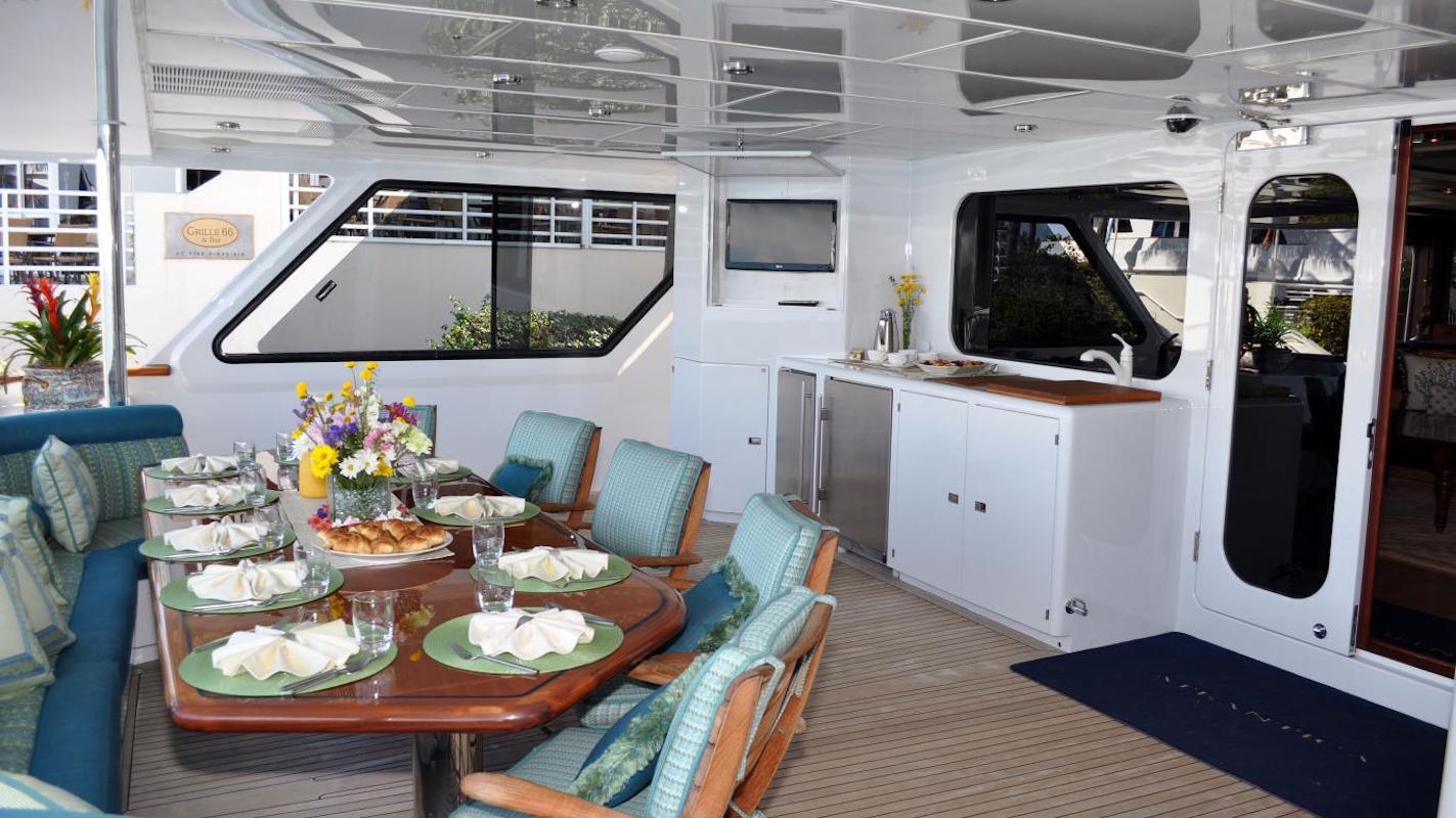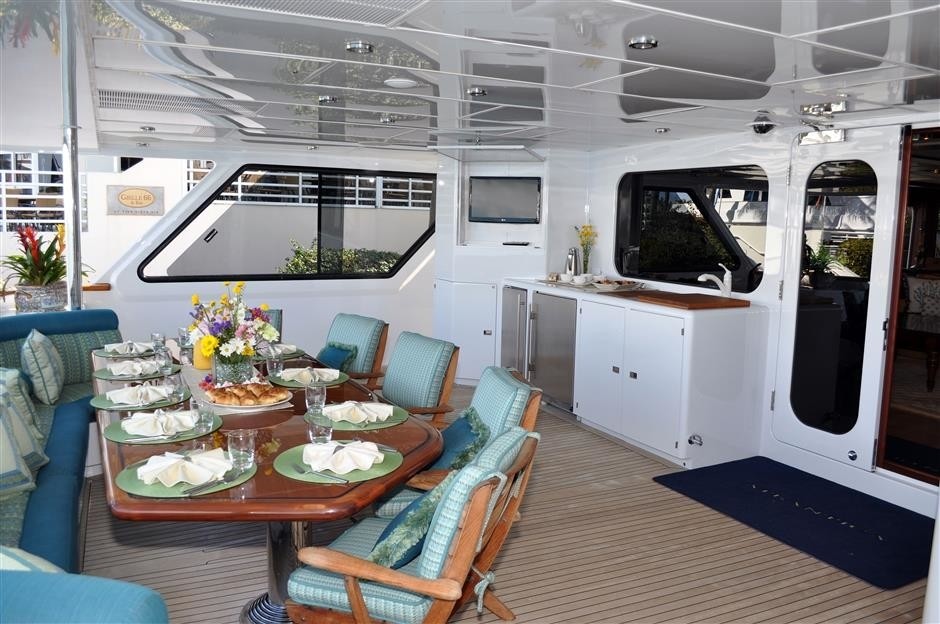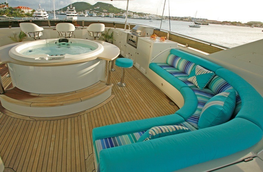 On deck, there is plenty of alfresco entertainment areas, including full dining for 12 guests on the lower aft deck, a casual bar and seating area on the upper aft deck. The magnificent sundeck hosts a semi-circular lounge seating, a Spa Pool, a bar with stools, sun pads and a BBQ grill and entertainment area.
