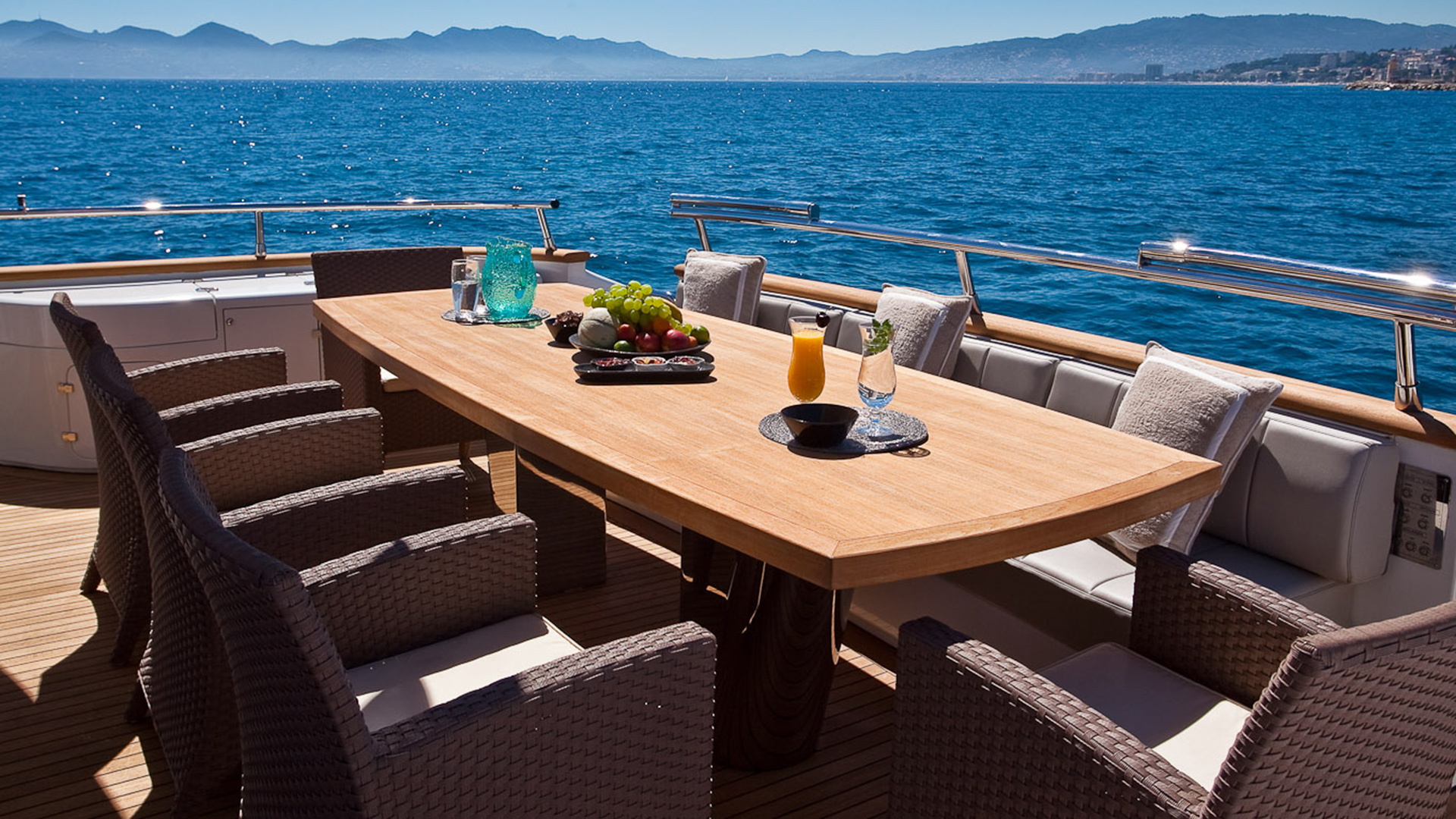 There is a large swim platform for sunbathing beside the water, and steps lead up to the main deck aft where guests can take an alfresco meal on the stern sofa. The bow is fitted with sunpads that can be shaded by a canvas for all-day outdoor relaxation.
