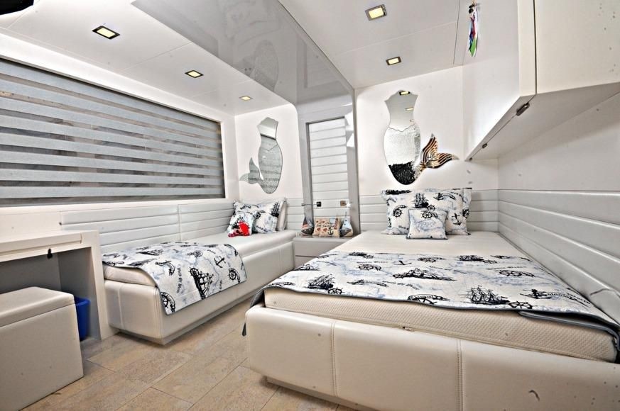 The 41m luxury yacht Azra can sleep 8 guests in 4 highly comfortable and stunning cabins. These comprise a master cabin as well as three guest cabins. Her friendly crew sleeps in four crew cabins.