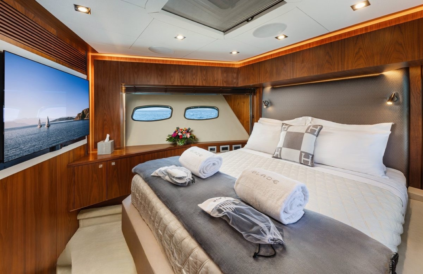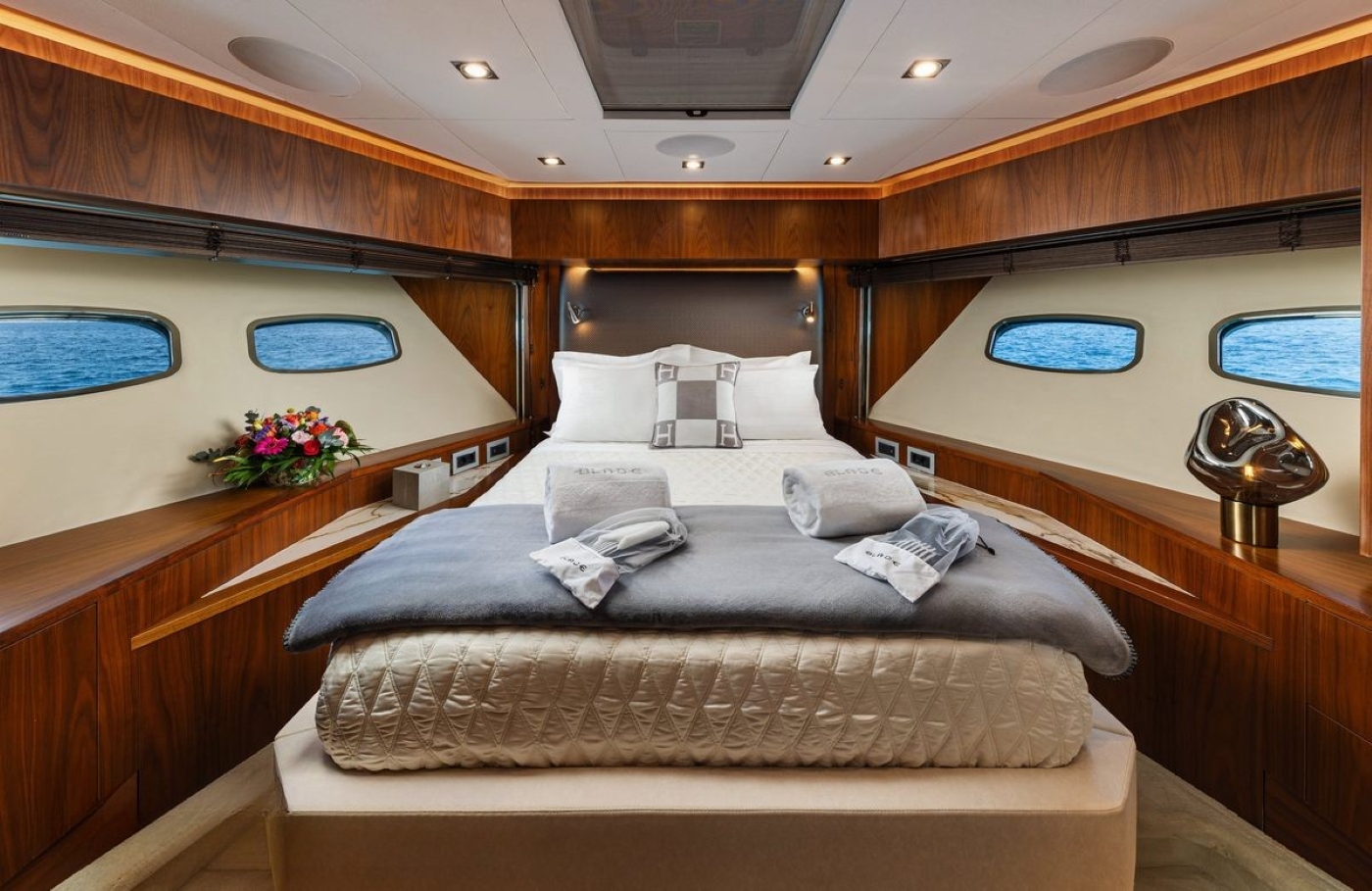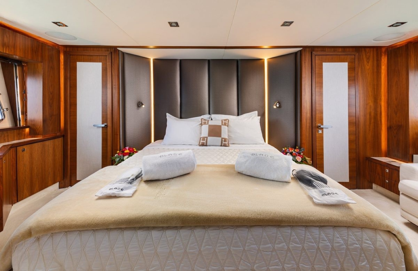 Luxury yacht BLADE 6 accommodates 8 guests in 4 en-suite cabins. The master cabin has a neutral tone promoting a relaxing ambiance, center lined double bed, vanity, love seat, walk in wardrobe and stunning en-suite facilities complete with his and hers sinks and full length mirrors. A VIP cabin is forward with a center lined double bed and serene contemporary décor. Two guests cabin feature 2 single beds each, soft lighting, mirrors and ports give an illusion of additional space.