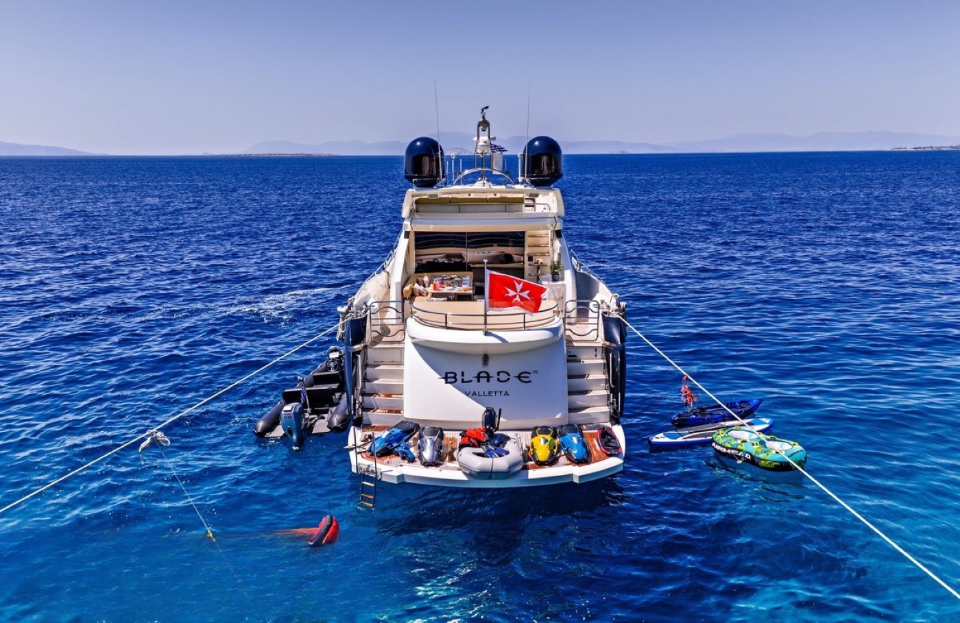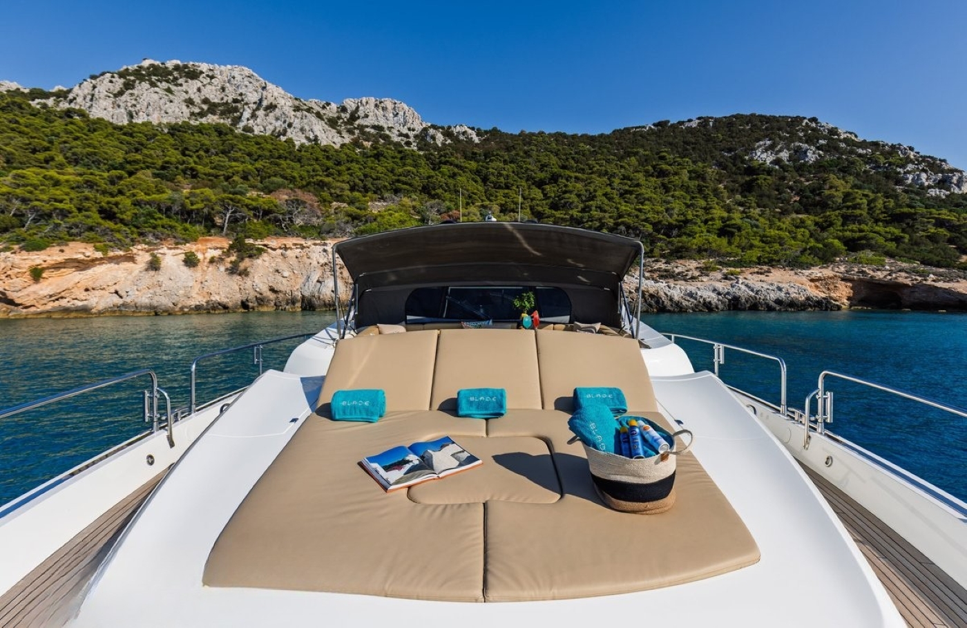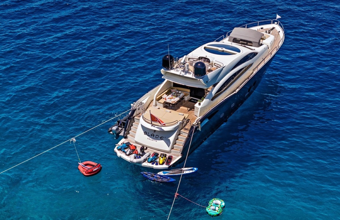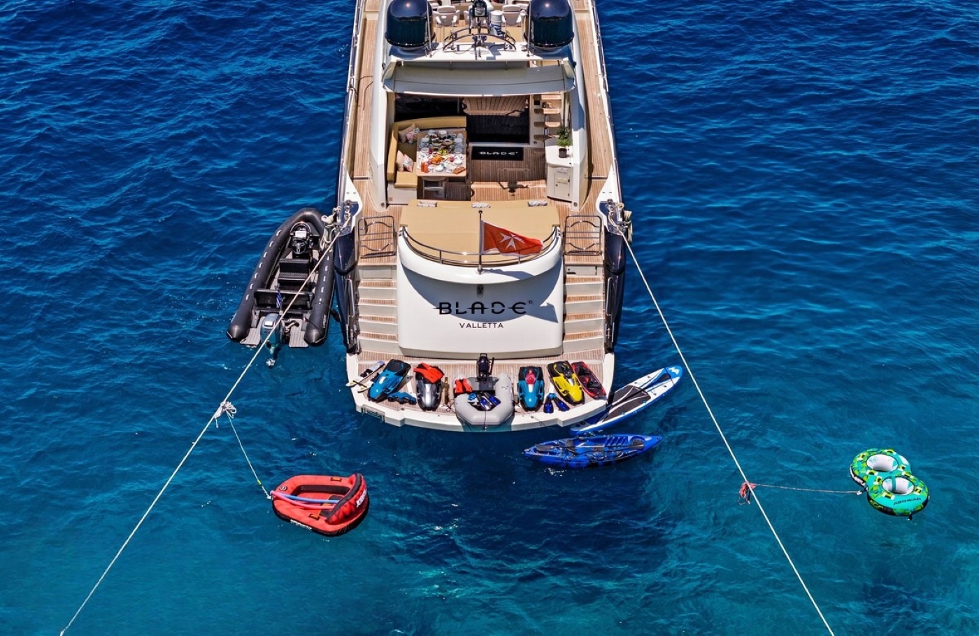 Stepping aboard the M/Y BLADE 6, the aft deck boasts plenty of exterior lounging and an alfresco dining option, an outdoor fridge and wet bar space keeps refreshments available at all times. Teak decks wrap around the yacht to the foredeck, with an additional alfresco dining option and a triple forward facing chaise lounge style sunpad. Guests wishing to make use of the water toys on offer may do so with ease, from the extended swim platform on the transom.
