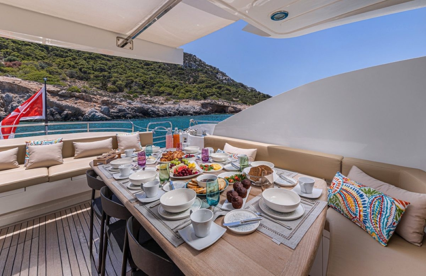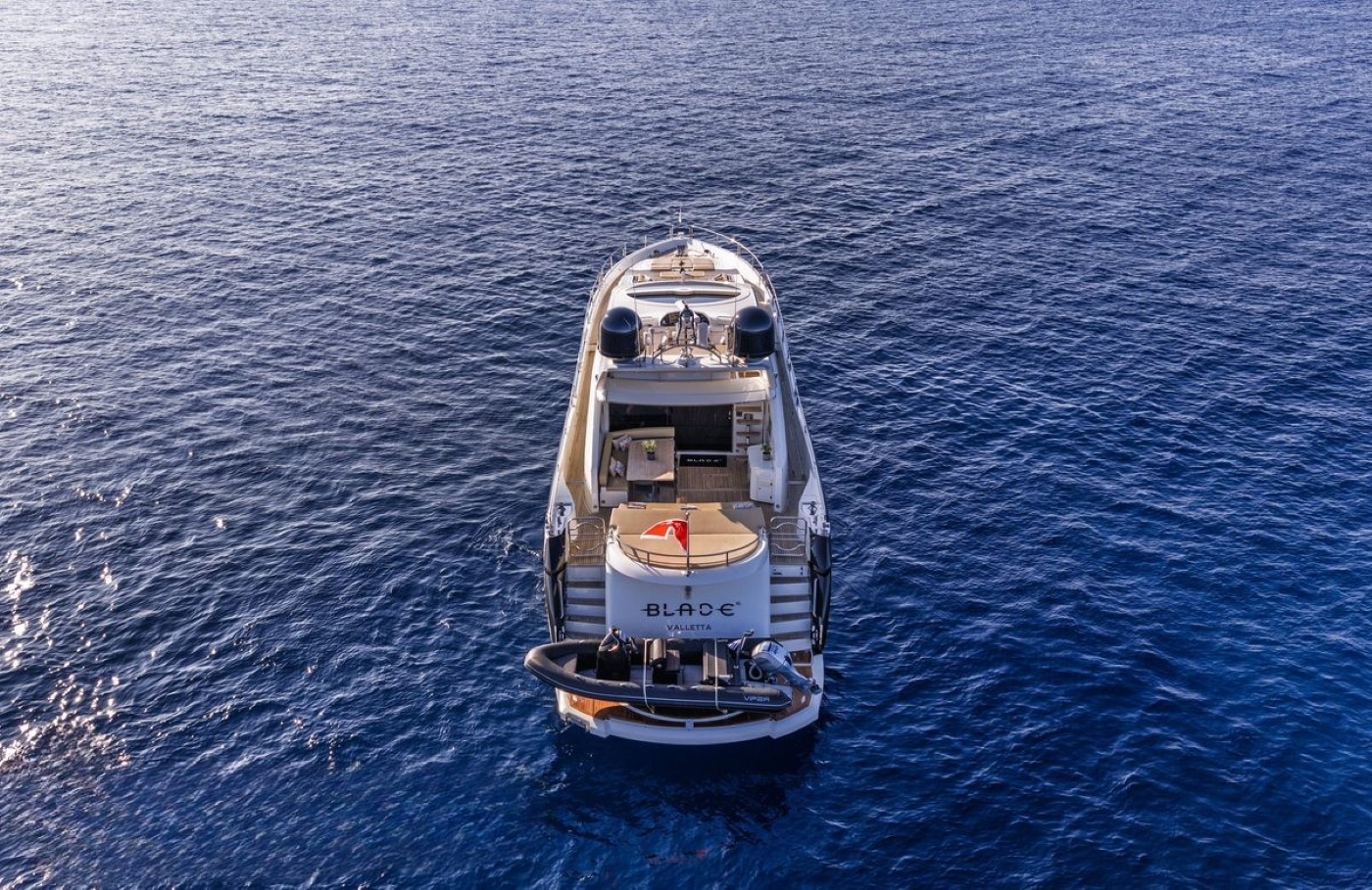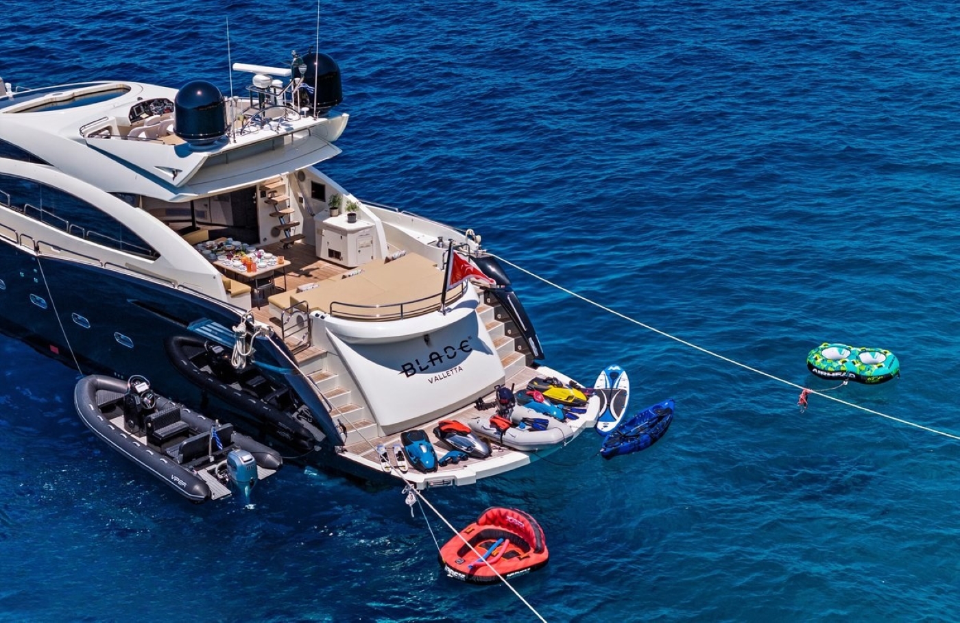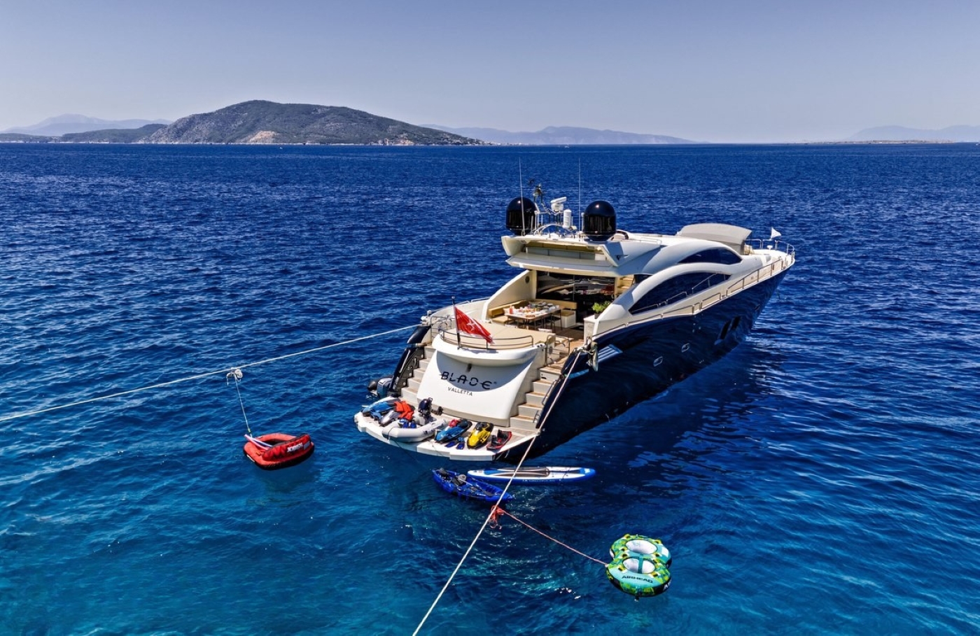 Stepping aboard the M/Y BLADE 6, the aft deck boasts plenty of exterior lounging and an alfresco dining option, an outdoor fridge and wet bar space keeps refreshments available at all times. Teak decks wrap around the yacht to the foredeck, with an additional alfresco dining option and a triple forward facing chaise lounge style sunpad. Guests wishing to make use of the water toys on offer may do so with ease, from the extended swim platform on the transom.