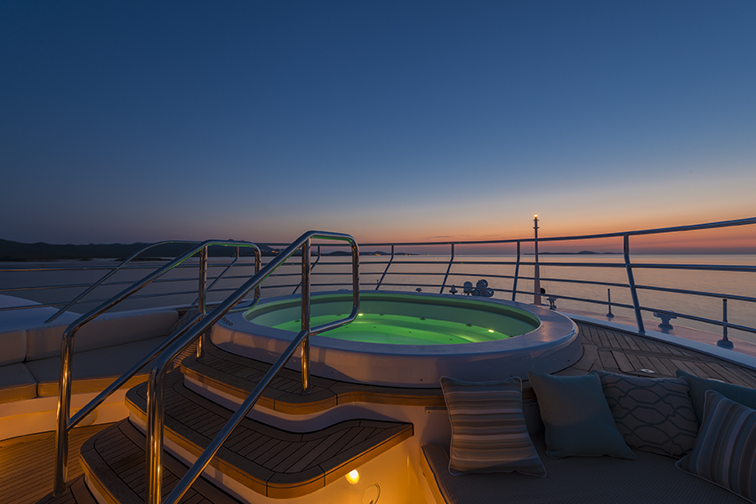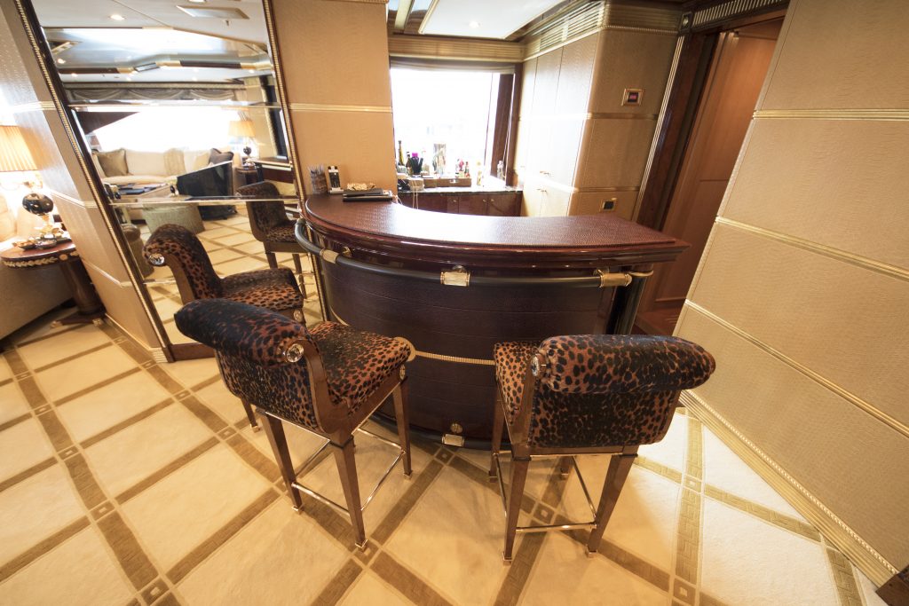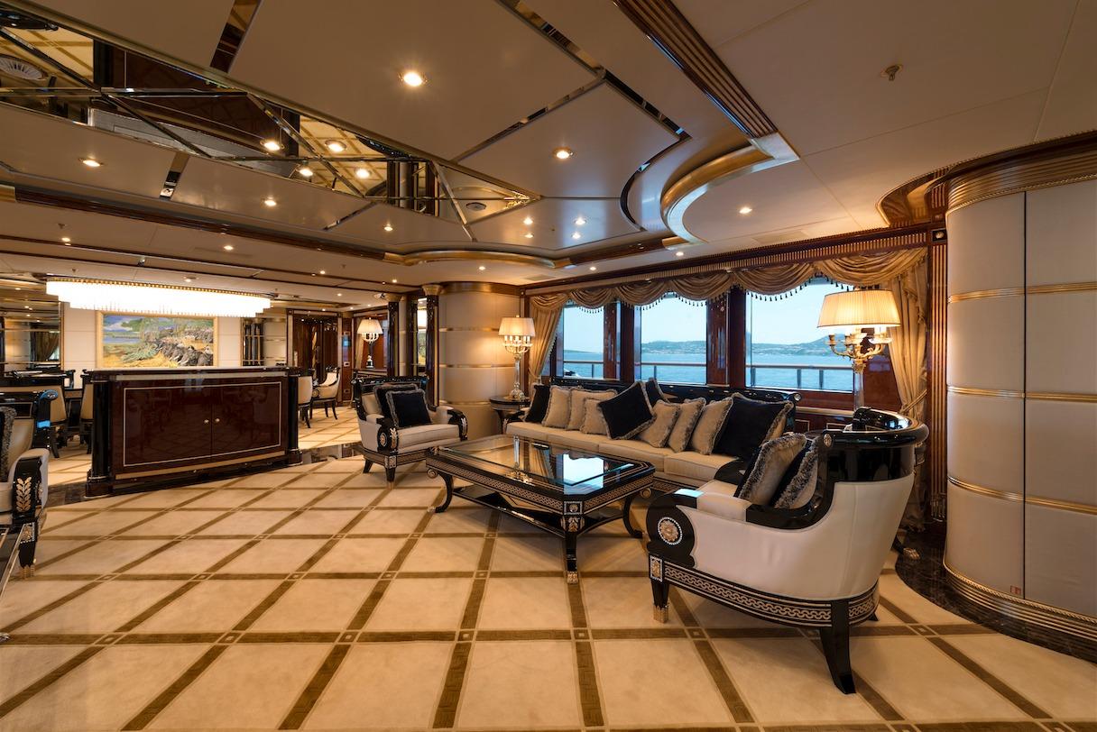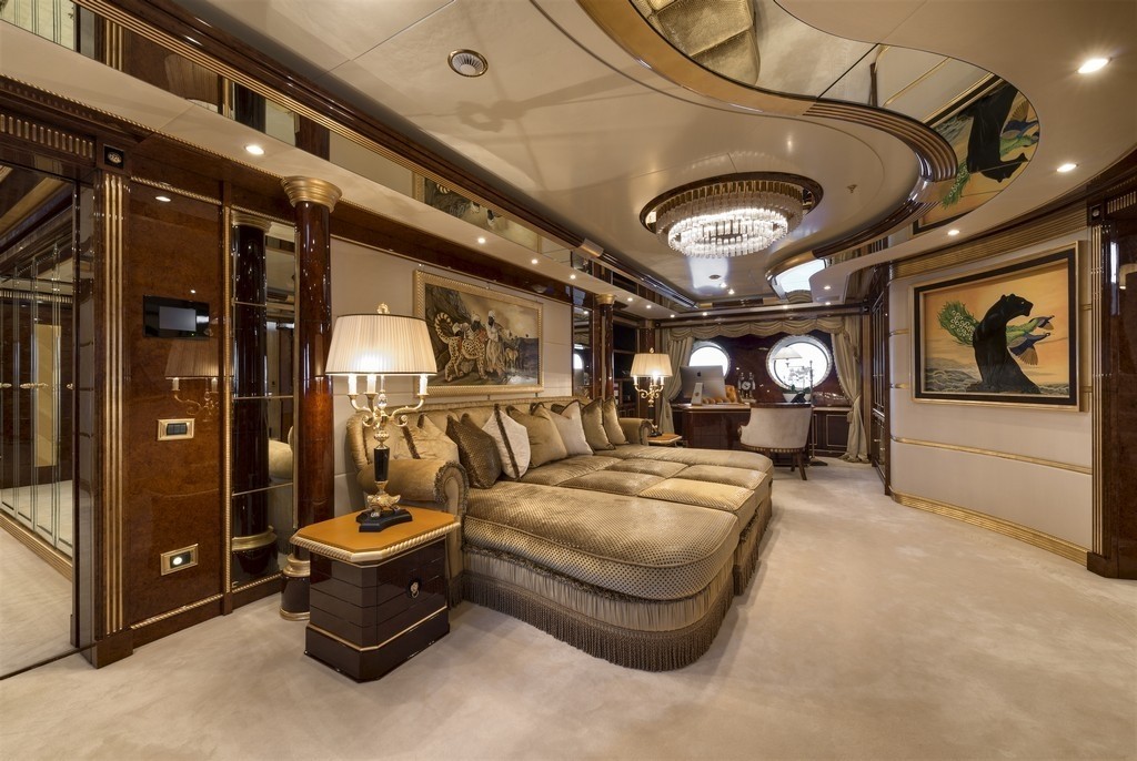Accommodation is offered in 6 opulent staterooms. The master suite features panoramic views, dressing room, lounge area, study and his and ger ensuite facilities with Jacuzzi. The VIP cabin is located on the bridge deck and features a king-size bed and spacious ensuite facilities with a Jacuzzi tub. Further four guest cabins include three double and one twin staterooms.