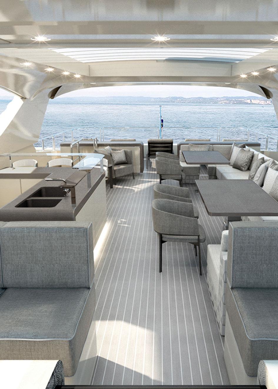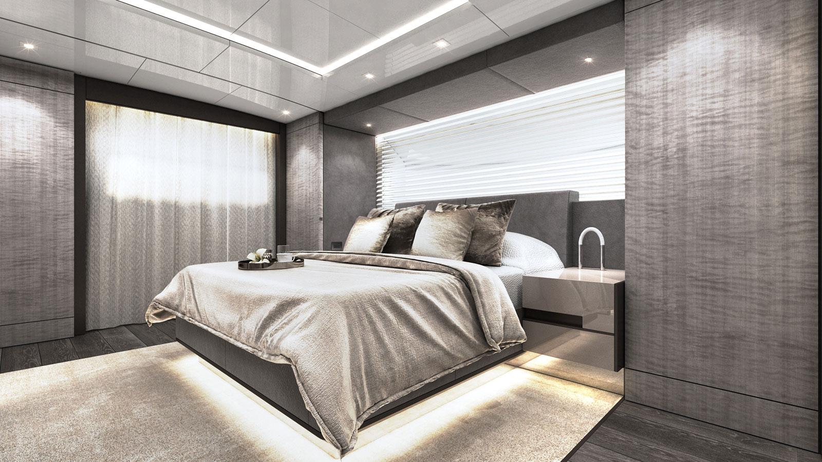 The lower deck contains a large beach club/tender garage in the stern with crew accommodation in the bow and the central section dedicated to the guest accommodation. Here, there is room for four en-suite cabins or a fifth cabin if the owner desires, which could instead be placed on the main deck forward.