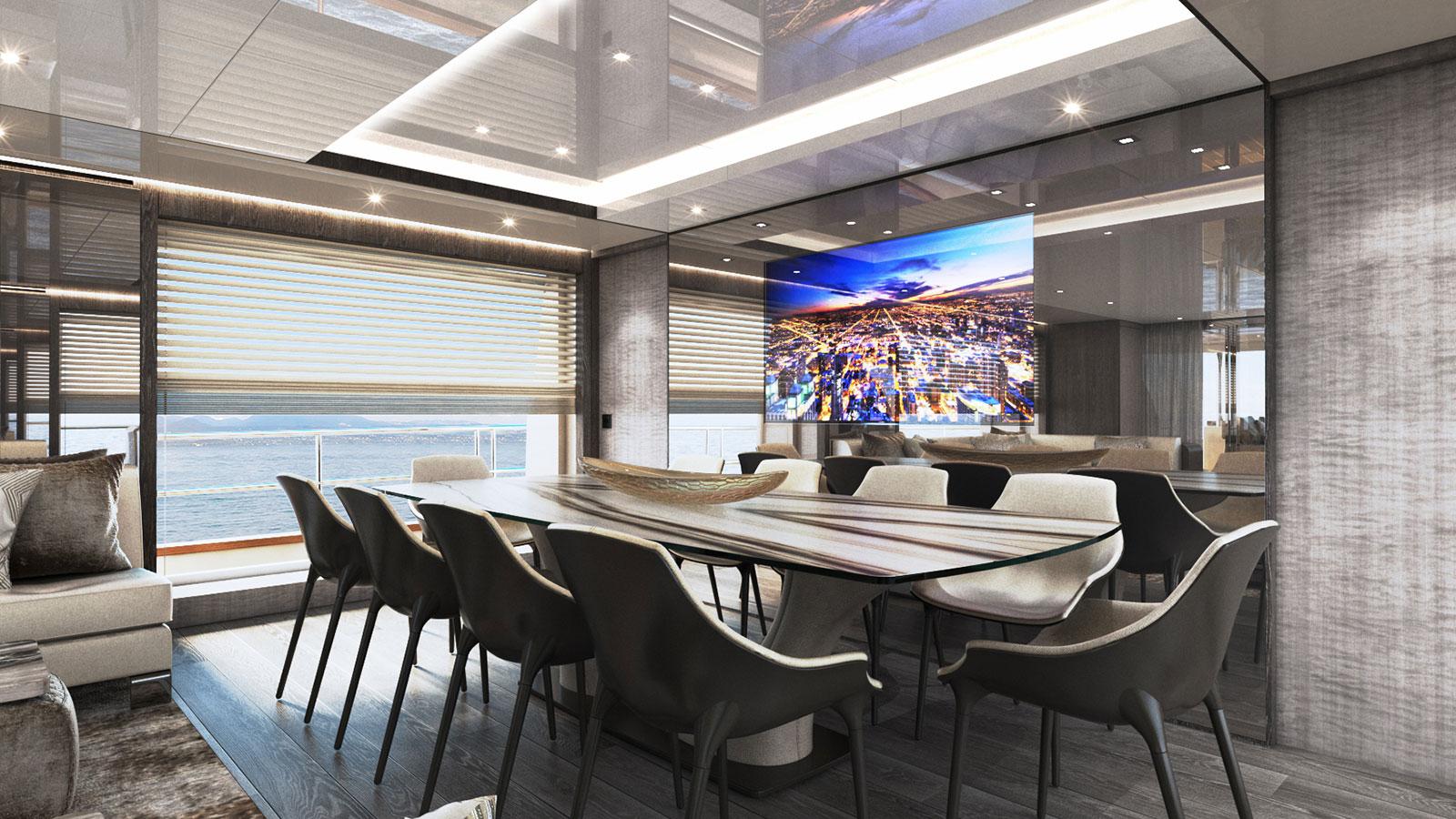The salon on the main deck benefits from full-height windows and the spacious interior incorporates a lavish formal dining area that will suit any special occasion.