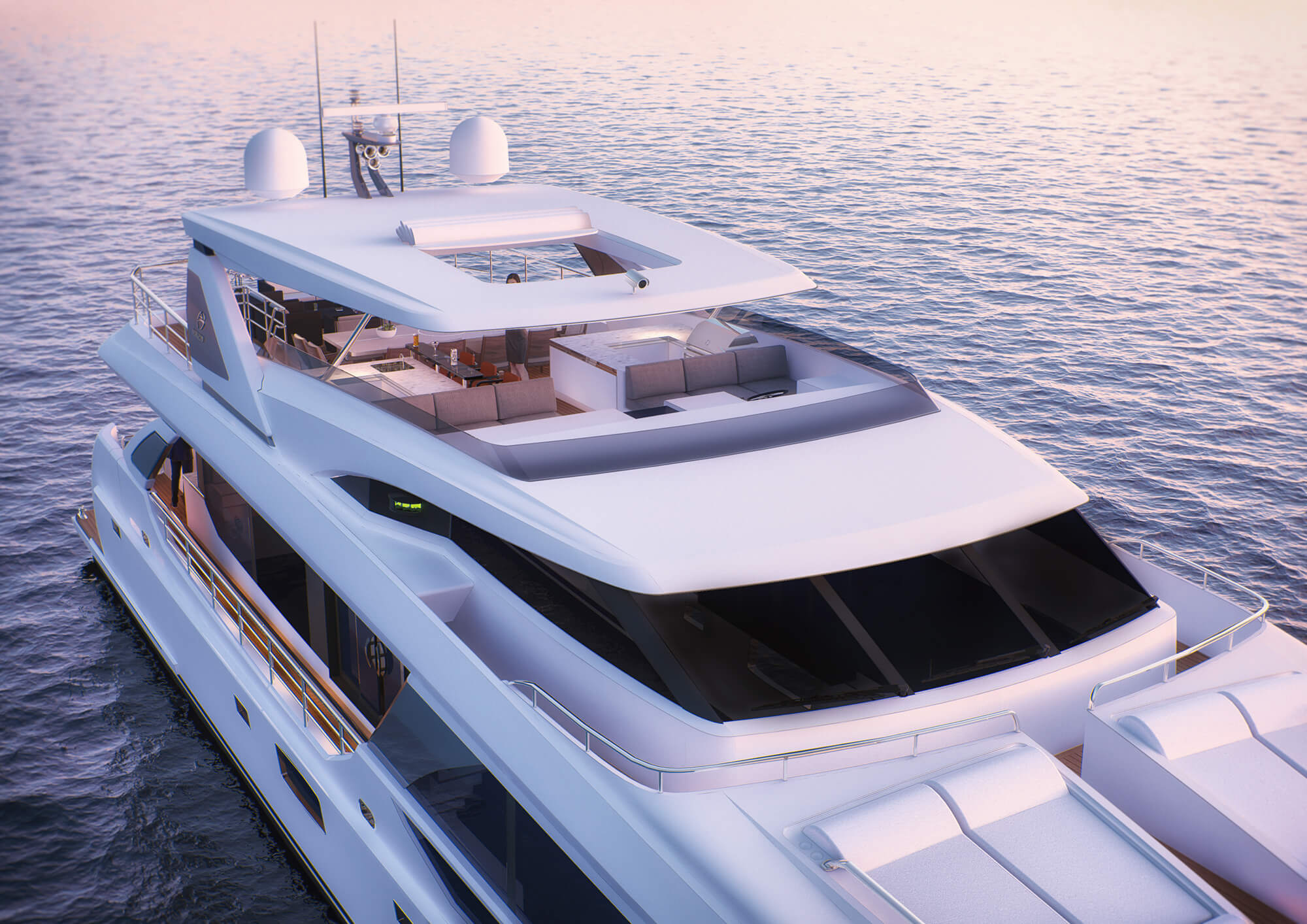 The lower deck swim platform offers an aft sofa and raised table for alfresco dining or general outdoor living in the shade. A starboard staircase connects to the flybridge, where a sun-exposed aft section hosts a comfortable lounge consisting of a forward-facing sofa, four armchairs and drinks tables. The central section contains an alfresco dining table while the forward area behind the helm station has a row of seating and a bar beneath an automated roof for sunshine or shelter as desired.