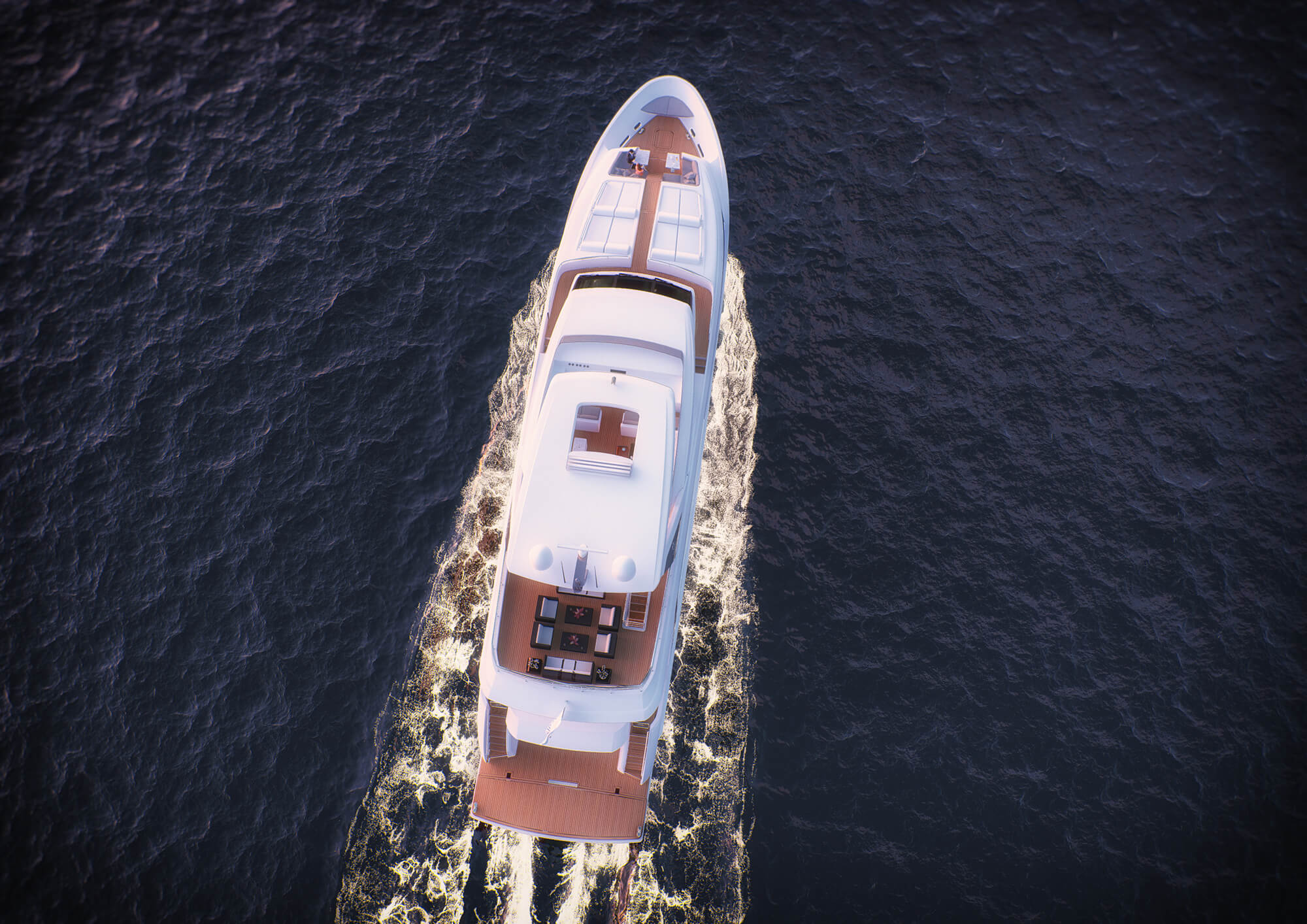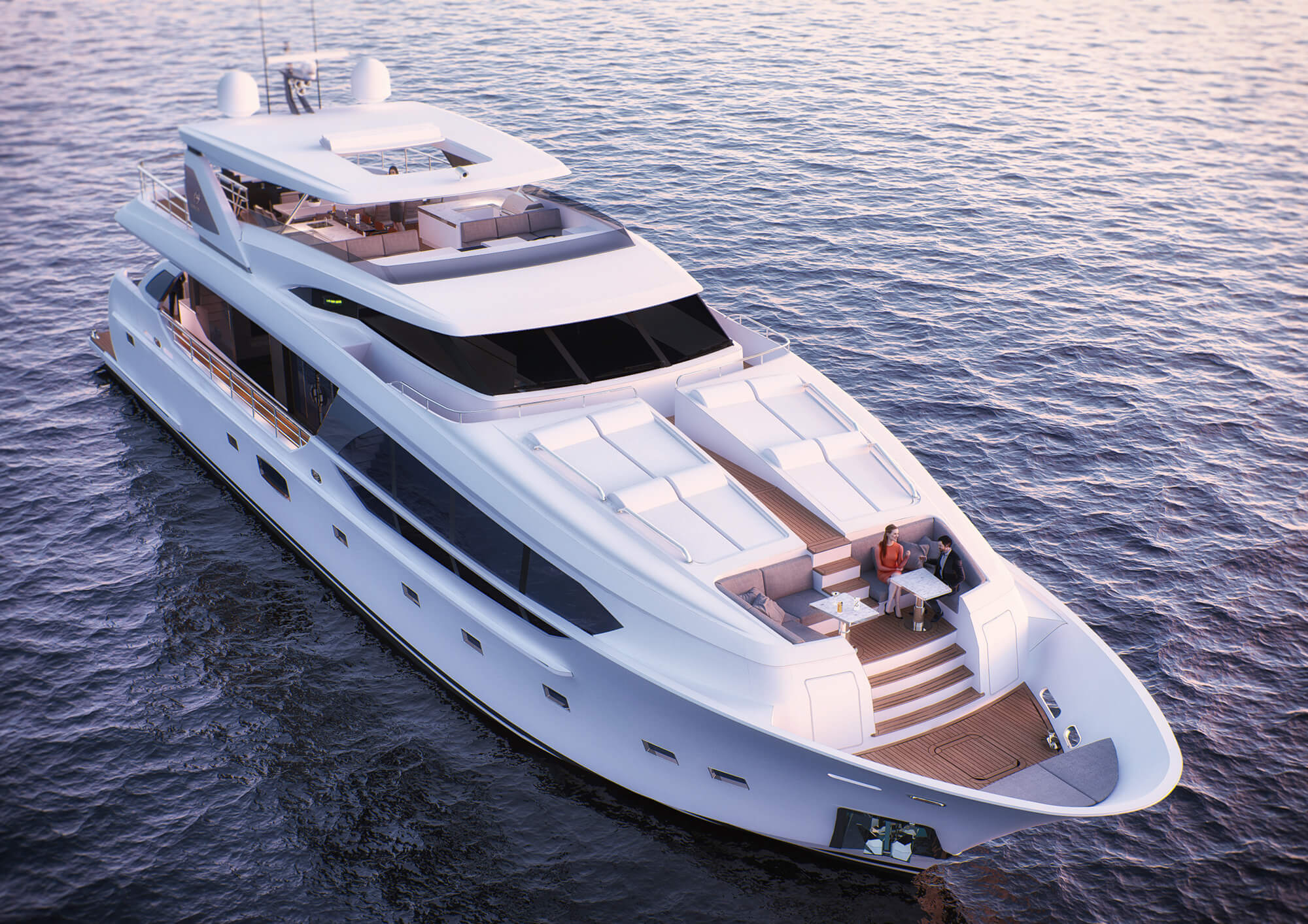The foredeck has been designed for the whole family to come together and relax in the sunshine and has a theatre-like appearance, placing two sunpads up and two down on both sides to accommodate a group of eight. Farther forward there are two L-shaped sofas and drinks tables sheltered from strong gusts, while the bow has a final seat for a couple of guests to sit together and watch the sunset.