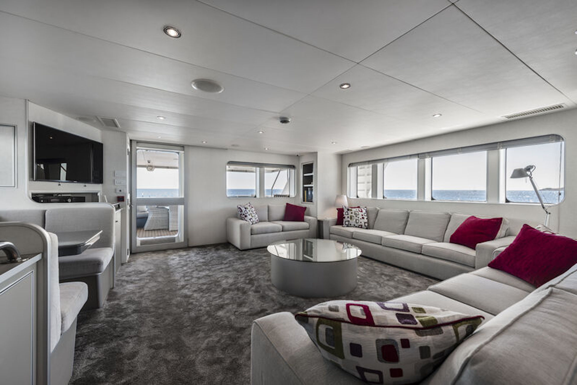 The yacht offers large teak deck areas designed for living, dining, entertainment or relaxing, so her owners can choose a private and peaceful corner, or enjoy a comfortable social environment. The interior of the yacht is also attractive with a modern, open and fresh feeling. Light wall coverings and casual bright upholsteries which have a subtle subtropical theme provide a relaxed and comfortable atmosphere.