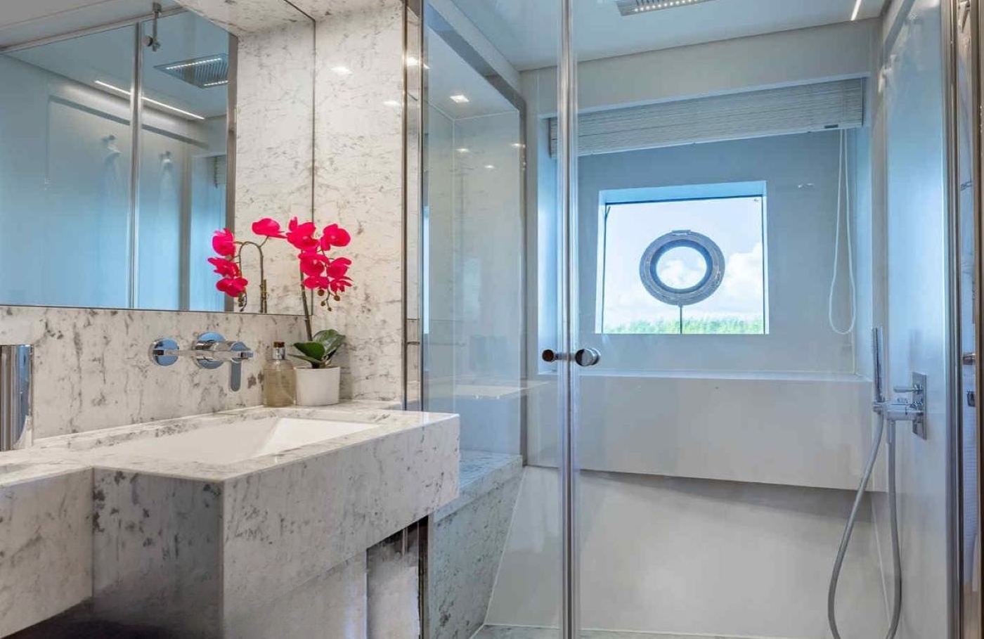 On the main deck the Master suite is placed forward and is accessed via a generously proportioned office off the main foyer. The bedroom is furnished with a king sized bed with a wall-mounted TV opposite, a desk to port and a lounge to starboard where occupants can sit and enjoy the views. The walk-in wardrobe is placed to port behind the king bed, and the his-and-hers bathroom is placed forward and has a central shower.