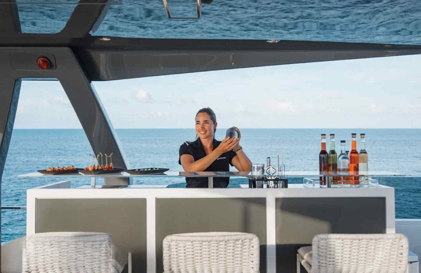 On the upper deck, a similar setup using a C-shaped sofa can be found along the stern and beneath the shade of the hardtop there is a grand alfresco dining table to seat up to 10 guests. The foredeck also features a C-shaped sofa and drinks table in front of the helm station creates a quiet spot for guests to relax and watch the sunset, and the bow is covered in sunpads for relaxation in the sunshine.